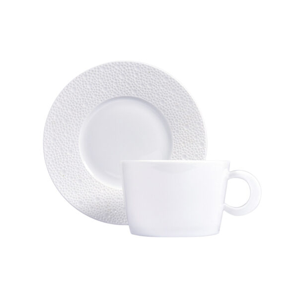 Breakfast cup and saucer from Écume White collection. Subtle effects within the material, masterful glazing work, the hollow engraving of Écume makes for a contemporary and poetic collection that produces a highly elegant and modern table setting.
