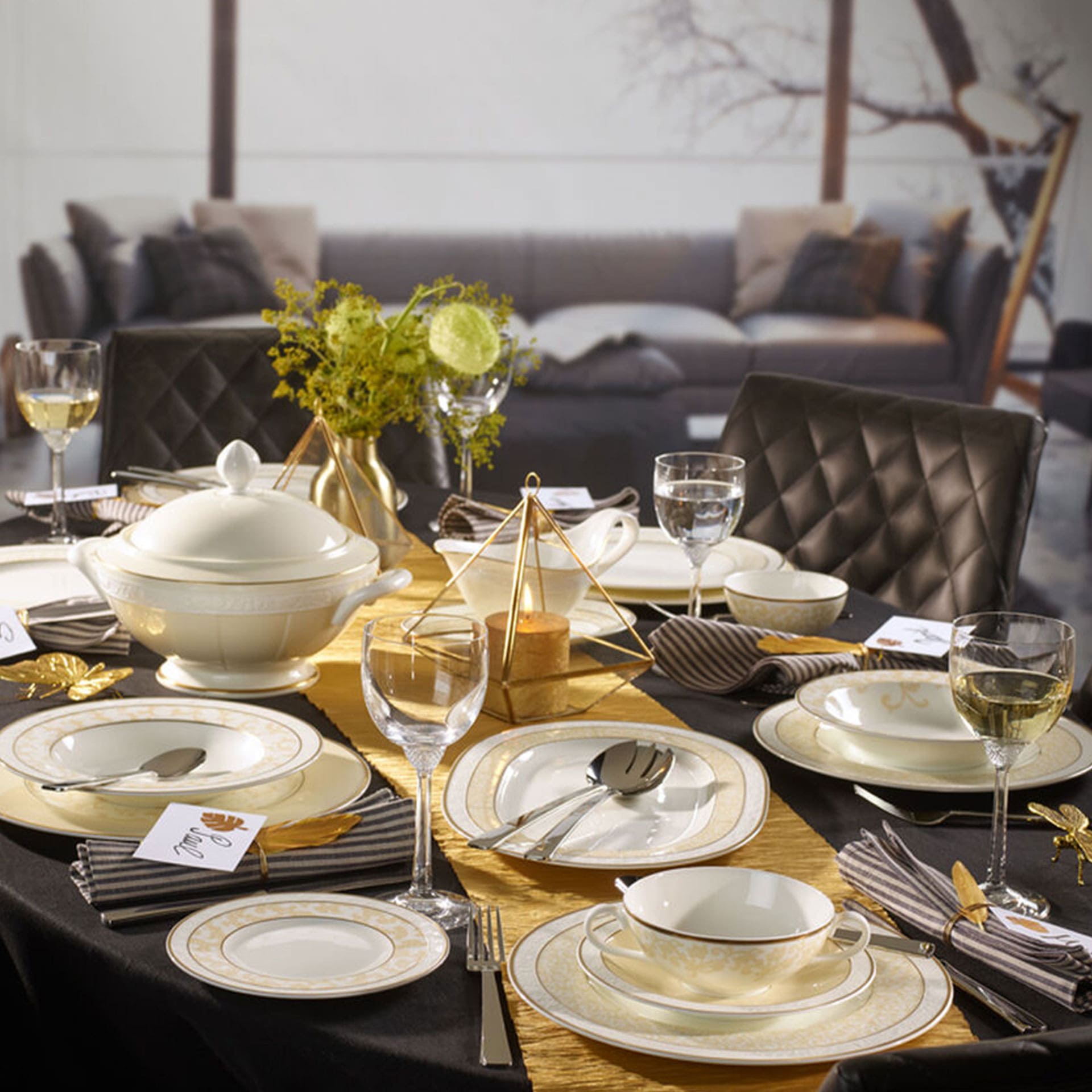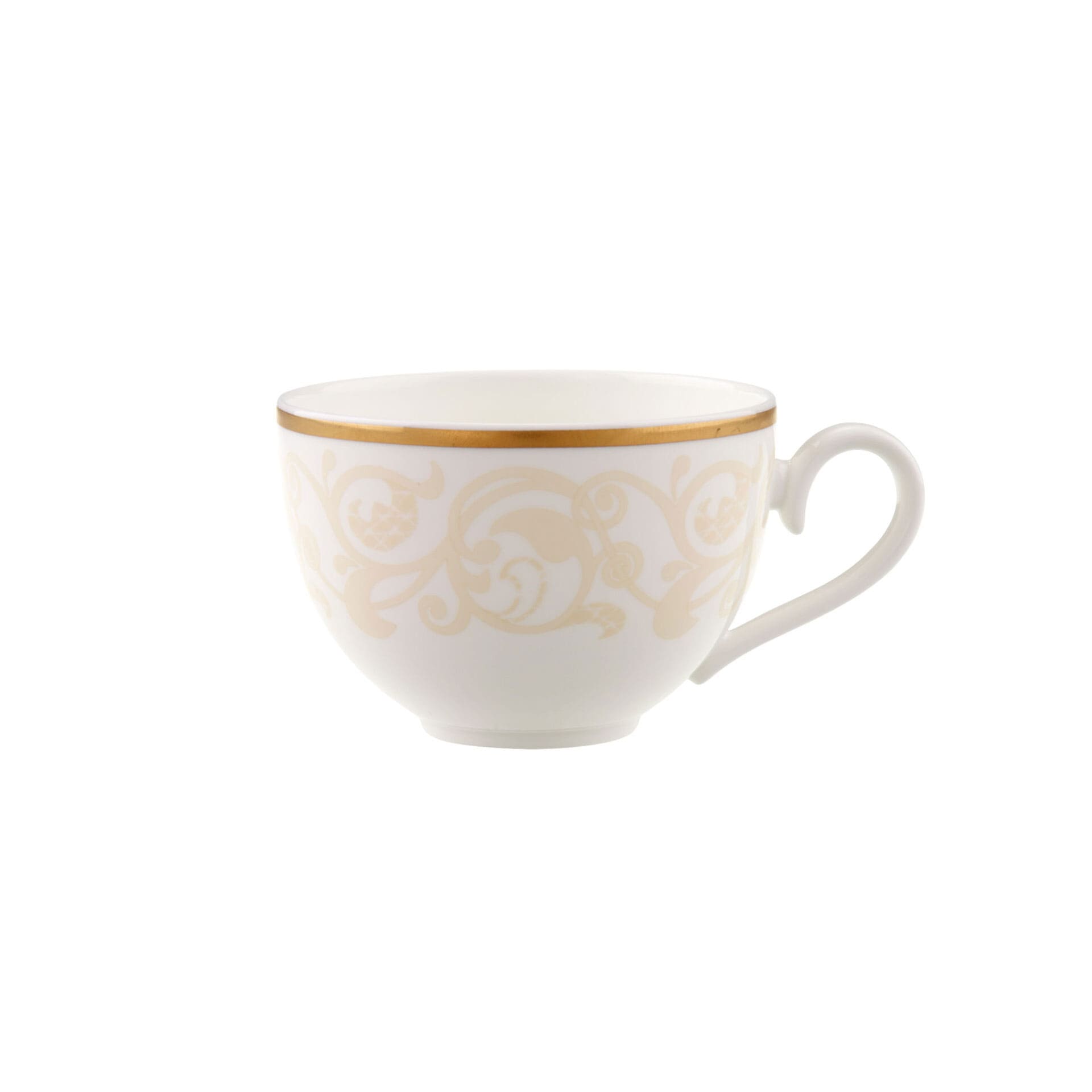 This coffee / tea cup forms part of Villeroy Boch’s elegant and luxurious dinnerware collection Ivoire. Ivoire is a fine and noble porcelain made of high-quality bone china that amazes by its successful combination of white and cream as well as its by its nice pattern. Every item of this range has been adorned by a golden coat making it look even more luxurious. The collection perfectly fits into a classic atmosphere as well as into the classic modern style and can be ideally completed with the matching cutlery, porcelain or Tablecloths by Villeroy Boch.