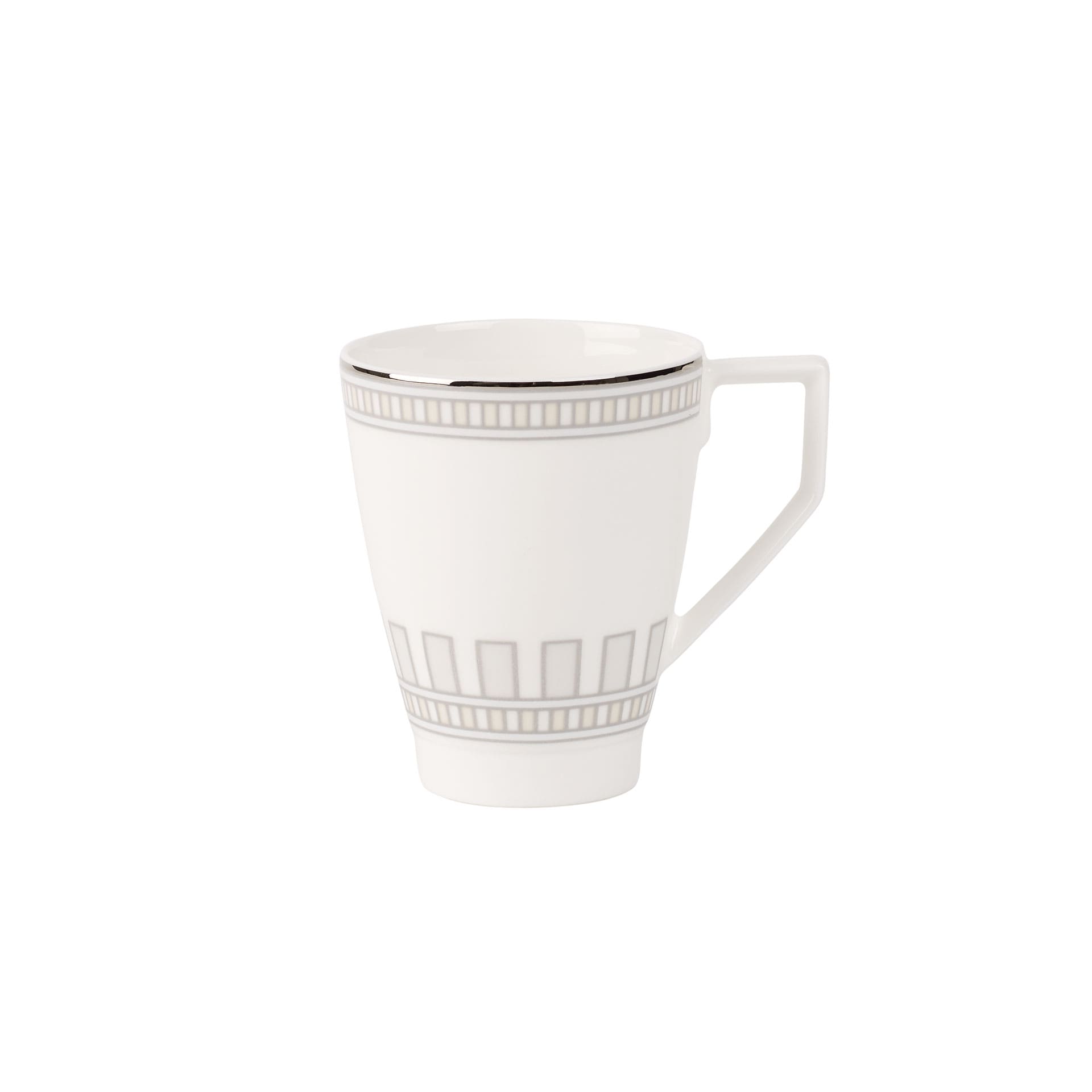 This coffee cup forms part of la Classica Contura, the decorated option of the pure white collection la Classica Nuova. Inspired by domes and rotundas the Home decor underlines the clear design language of the tableware with fine lines and graphic patterns. It can be used alone but can also be wonderfully combined with the white version. To complete the table-settings a selection of matching accessories has been developed: glass candle stands in two different sizes with matching candles, and coordinating knife rests and napkin rings, also of glass.