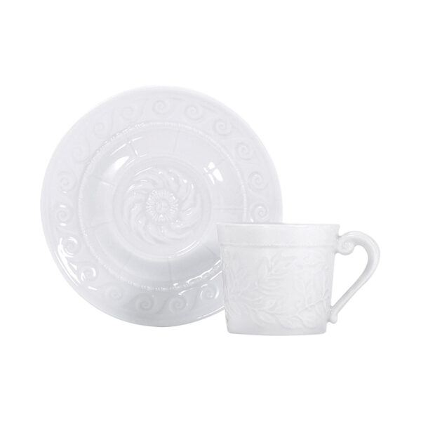 Espresso cup and saucer from Louvre collection. The motifs engraved on the pieces that make up this white service create a stylish catalogue detailing the various periods of French architecture from the Renaissance through to the Second Empire which characterize this palace.
