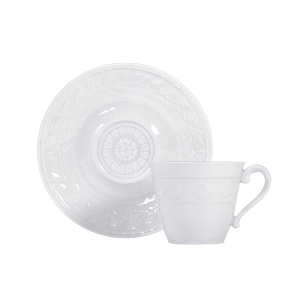 Espresso cup and saucer from Louvre collection. The motifs engraved on the pieces that make up this white service create a stylish catalogue detailing the various periods of French architecture from the Renaissance through to the Second Empire which characterize this palace.