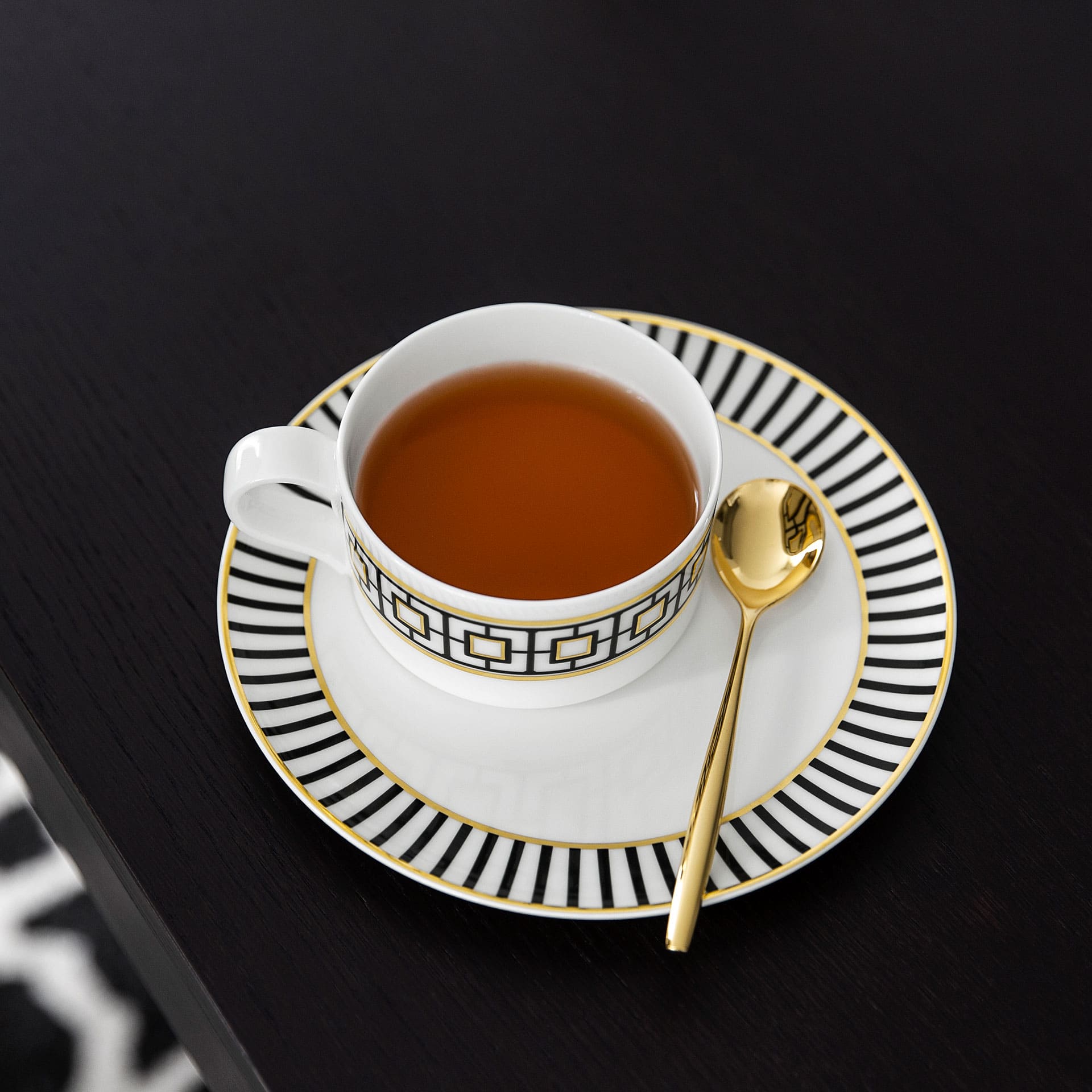 Whether a purist white or a geometric pattern in expressive black and gold – all pieces in the high-quality MetroChic tableware and gifts collection can be combined with each other in many different ways. The elegant and particularly resistant Premium Bone Porcelain transforms every table into a modern style statement of timeless elegance. This versatile tea cup promises the perfect tea experience and will delight you for a long time with its brilliant pattern thanks to Inglaze Gold technology. Treat yourself to urban design and delight your guests.