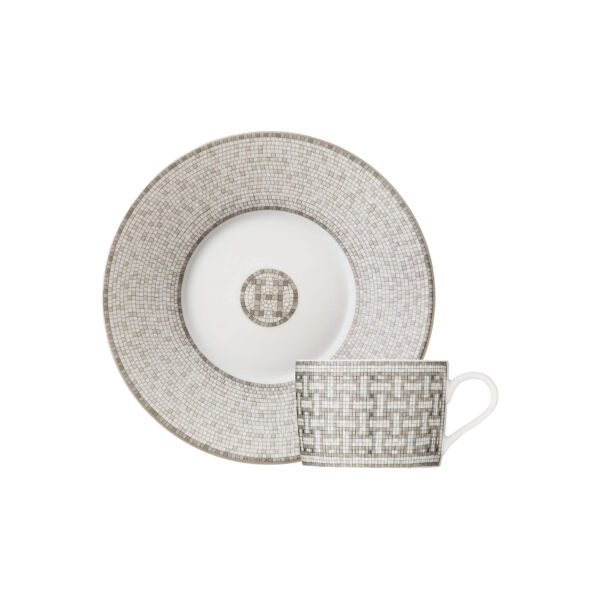 Tea cup and saucer from Mosaïque au 24 Platine. This monochromatic interpretation of the Mosaïque au 24 pattern features shades of grey embellished with platinum.