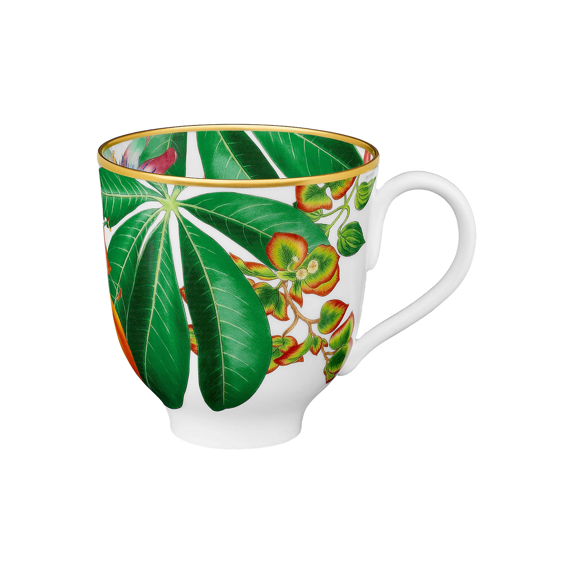 Mug from Passifolia collection. Nathalie Rolland-Huckel designed Passifolia, the tableware collection by Hermès, between two worlds, at the threshold between botanical tradition and art. Drawn from nature, her designs reveal delicate authenticity. From the side plates to the presentation platters, the coffee cups to the dinner plates, the thirty pieces that make up the Passifolia tableware collection are the fruit of an artisanal adventure, an exploration of know-how by the house of Hermès. New techniques and a series of skills were developed to faithfully reproduce the artist’s lush tropical palette and the delicacy of her line.