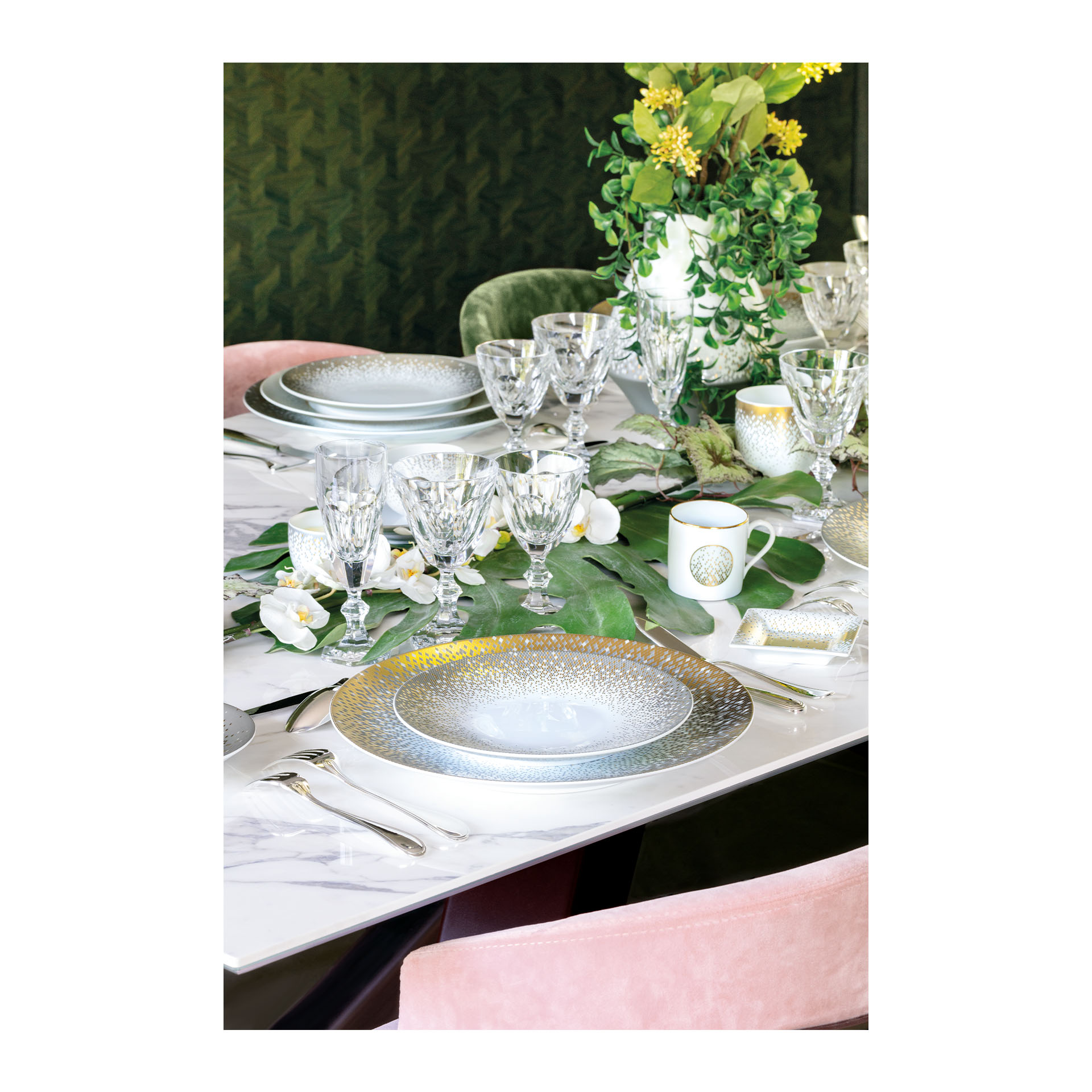 Souffle dOr Tea cup and saucer. Haviland astonishes us again and again with its new and exquisite porcelain designs – as is the case with its breathtakingly beautiful Souffle dOr line. For this Limoges porcelain dinner service, the designer Olivia Decaris took her inspiration from a supernova – a phenomenom that occurs when a massive star explodes at the end of its natural life and illuminates the entire Milky Way. Each individual piece of the Souffle dOr from Haviland is adorned with a different design. Dazzling grey hues endeavour to outshine the matt gold.