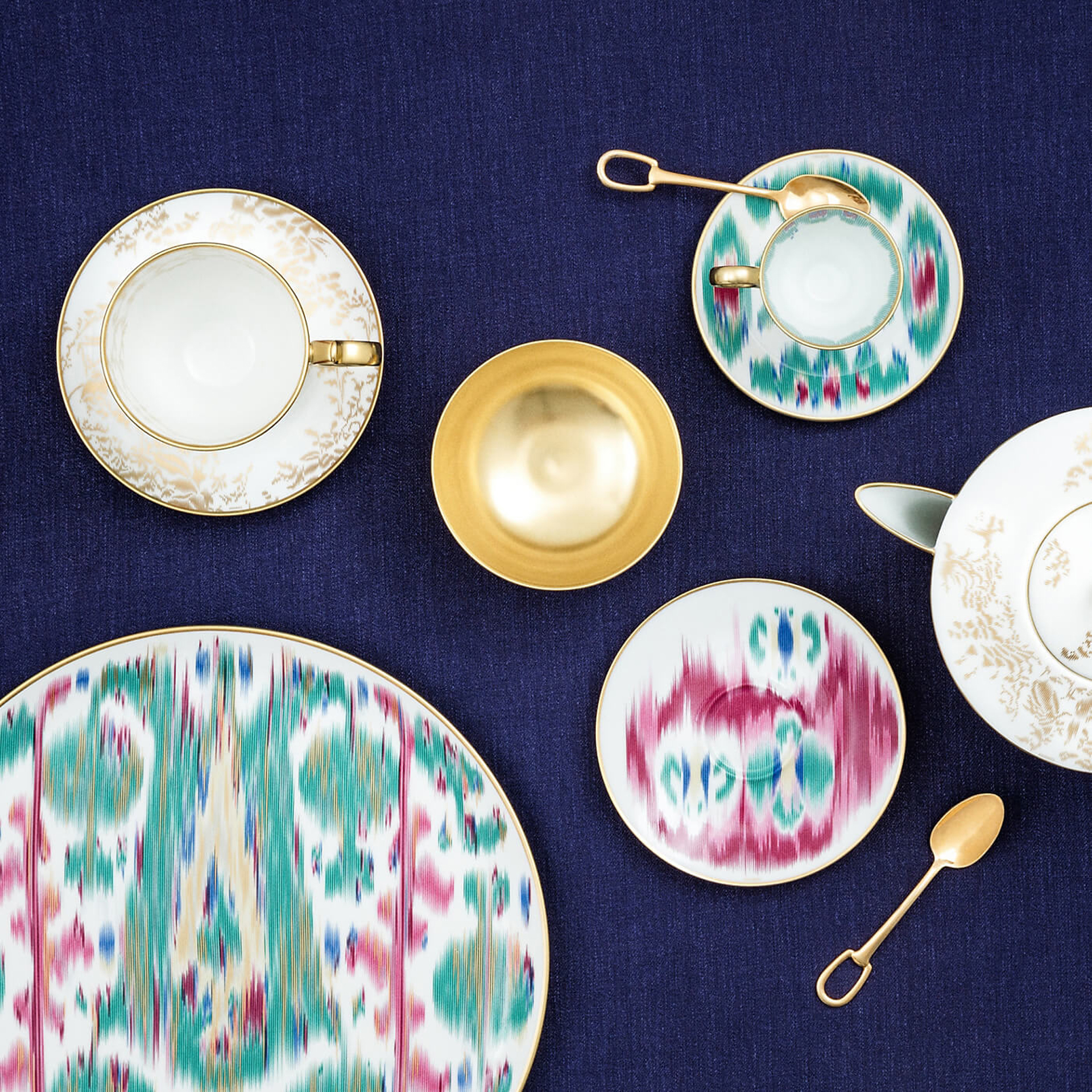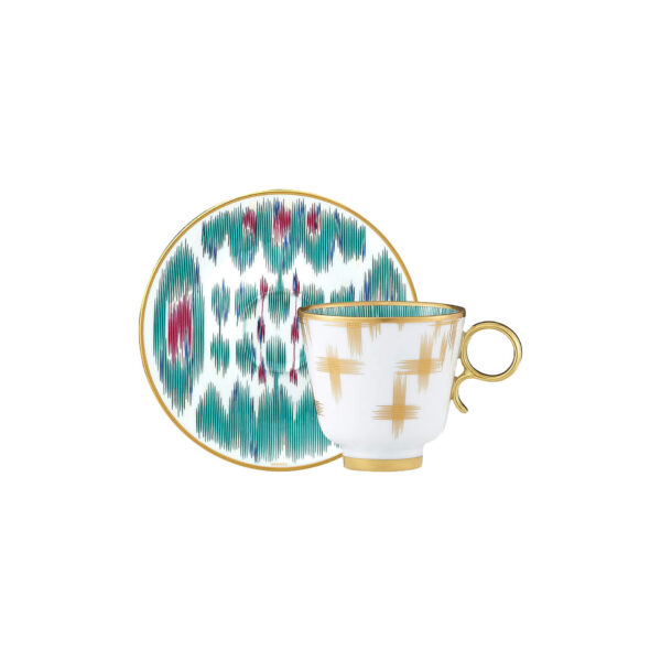 Coffee cup and saucer from Voyage en Ikat collection. Inspired by ikat, an exceptional weaving and dyeing technique originating in Asia, Voyage en Ikat celebrates intermingled uses and an ongoing dialogue between East andWest. More than twenty hues centered on sapphire, ruby and emerald, are enhanced by 24-carat matte gold and come to life in designs composed ‘thread by thread’.