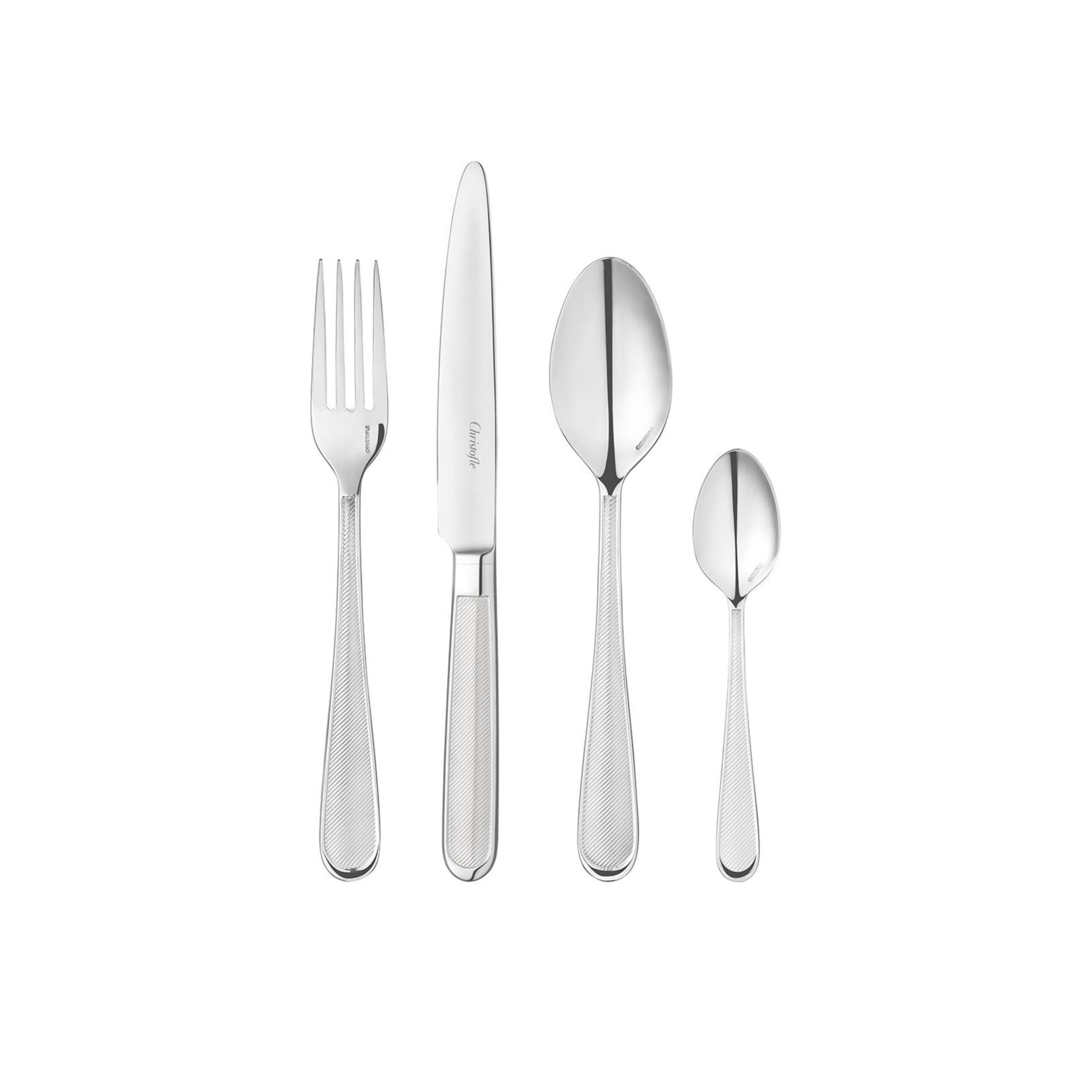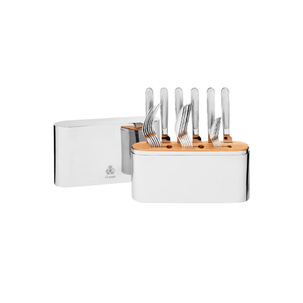 This 24-piece stainless steel 24-piece set contains dining essentials for 6 people including 6 table forks, 6 dinner knives, 6 table spoons, and 6 coffee spoons. A mirror polished stainless steel case with a white oak wood interior disk stores the cutlery. Please note that the case and flatware is packaged separately to prevent scratching during shipment. Christofle introduces a new set inspired by the oblong shape of the Parisian Place de la Concorde. Concorde combines beauty with convenience.