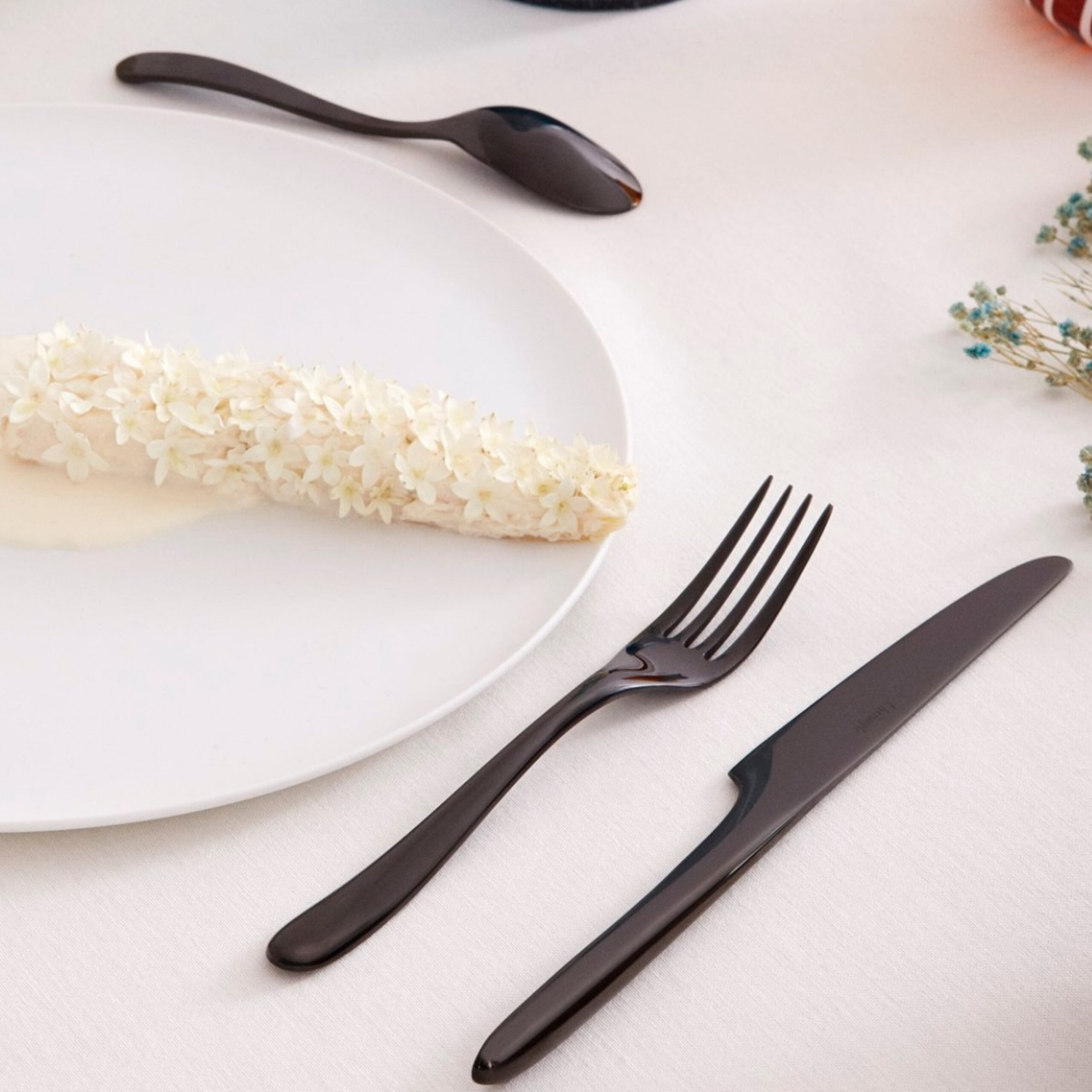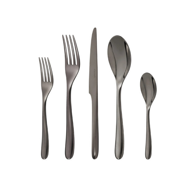 This stainless steel 5-piece place setting in black comes with one table spoon, one table fork, one table knife, one coffee spoon and one dessert fork. The black coloring is obtained by applying colored metal alloys to the surface of the flatware. This process enhances the pure lines of the flatware and adds an dash of modernity to the finest tables.