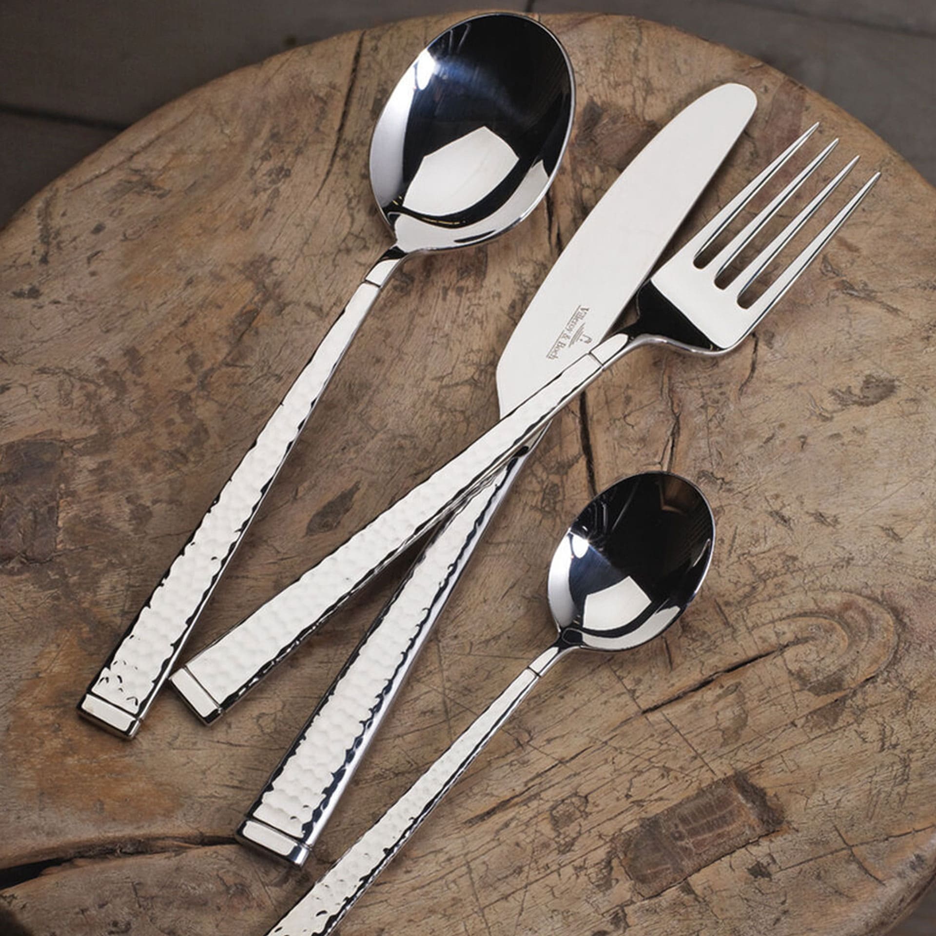 Blacksmith dessert knife. Placed next to classic or exquisite porcelain, the Blacksmith cutlery collection comes across as expressive, of high-quality and impressively beautiful. The hammer-finish effect lets light shimmer gently on the cutlery, giving it a rustic touch.