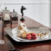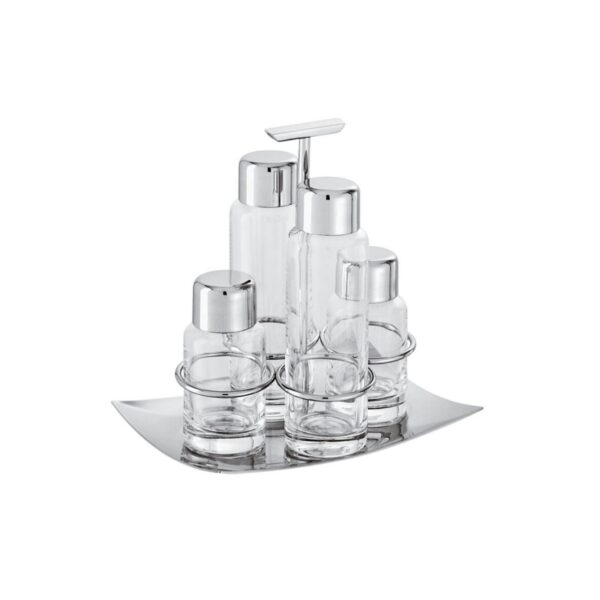 It includes plate 13×18 cm, oil pourer, vinegar bottle, salt dispenser and pepper dispenser.