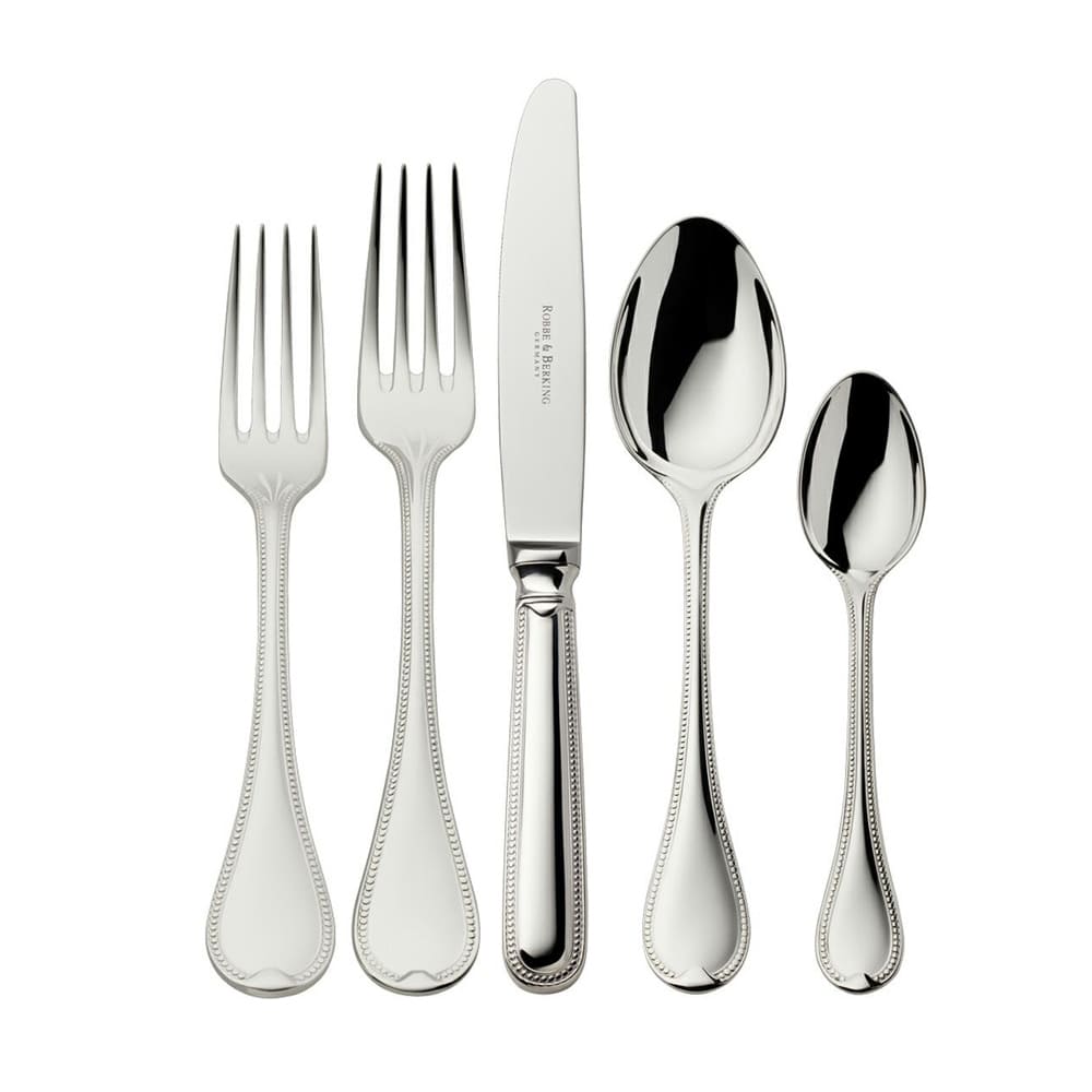Französisch-Perl takes its lightness and charm from the end of the Rococo period. However, the clear shape of the silver cutlery shows the influence of the early French Classicism. The striking, sculptured beading displays top artisan silversmith artwork. The revered Paris silversmiths of the 18th century could not have manufactured this elegant pattern more finely.