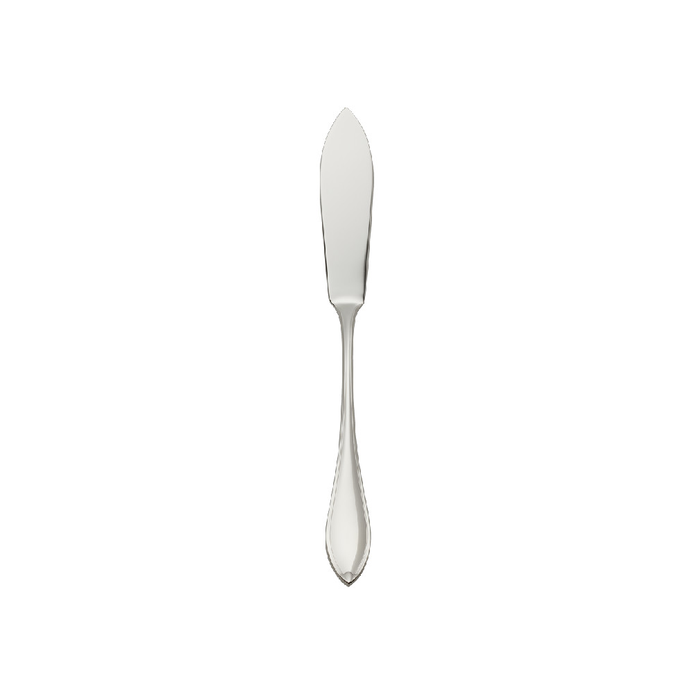The narrow, point oval Navette cut on precious stones gives this cutlery its name – and the gently-swung, lily-shaped handle with the sculptural overlap at its end truly honours this name.