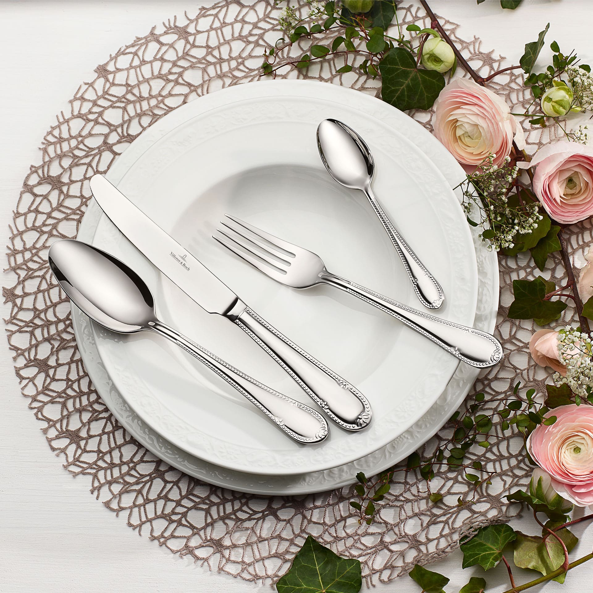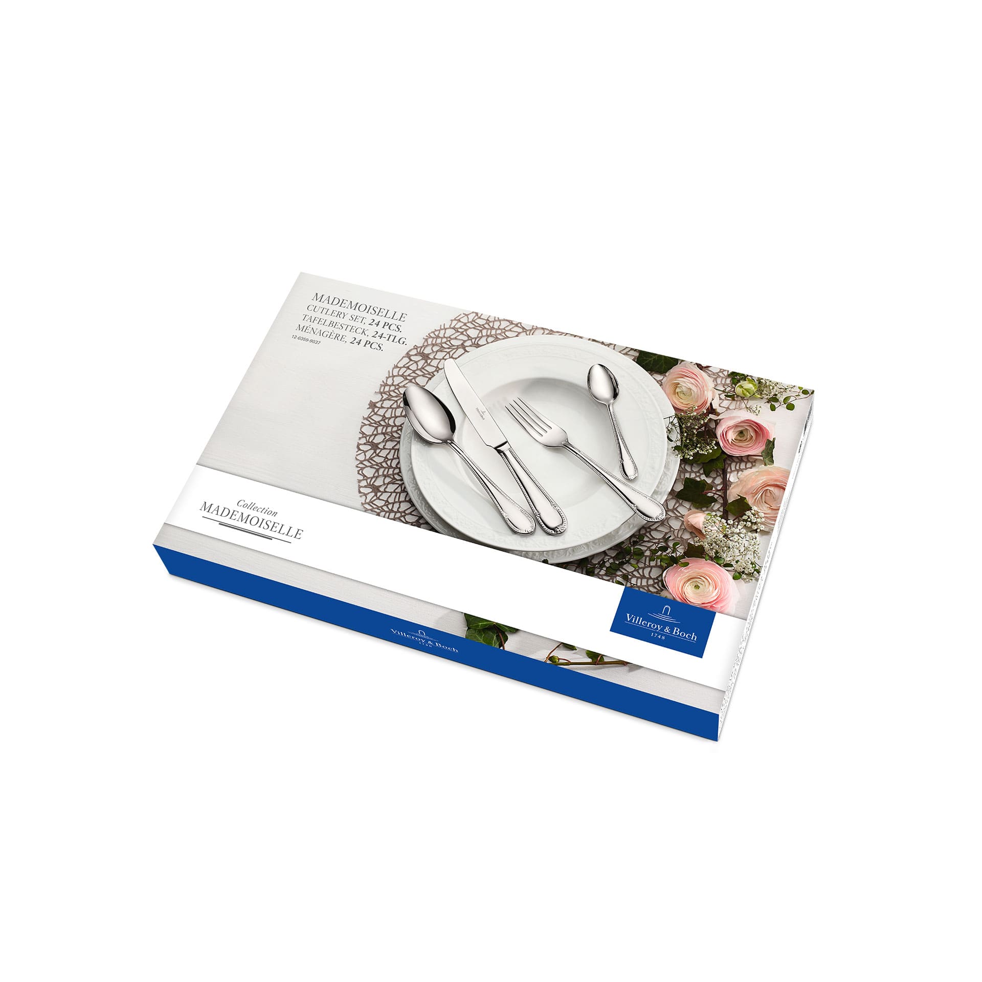 Round lines and delicate embossing on the handle give the dishwasher-safe stainless steel Mademoiselle cutlery collection an elegant, feminine touch. The set comes in an attractive cardboard box with an image of the product. Design experts will be impressed by this set, whether as a housewarming or wedding gift or for their own family. It contains beautiful and practical cutlery set for up to six people, even for everyday meals. Enhance your cutlery for any occasion with Mademoiselle.