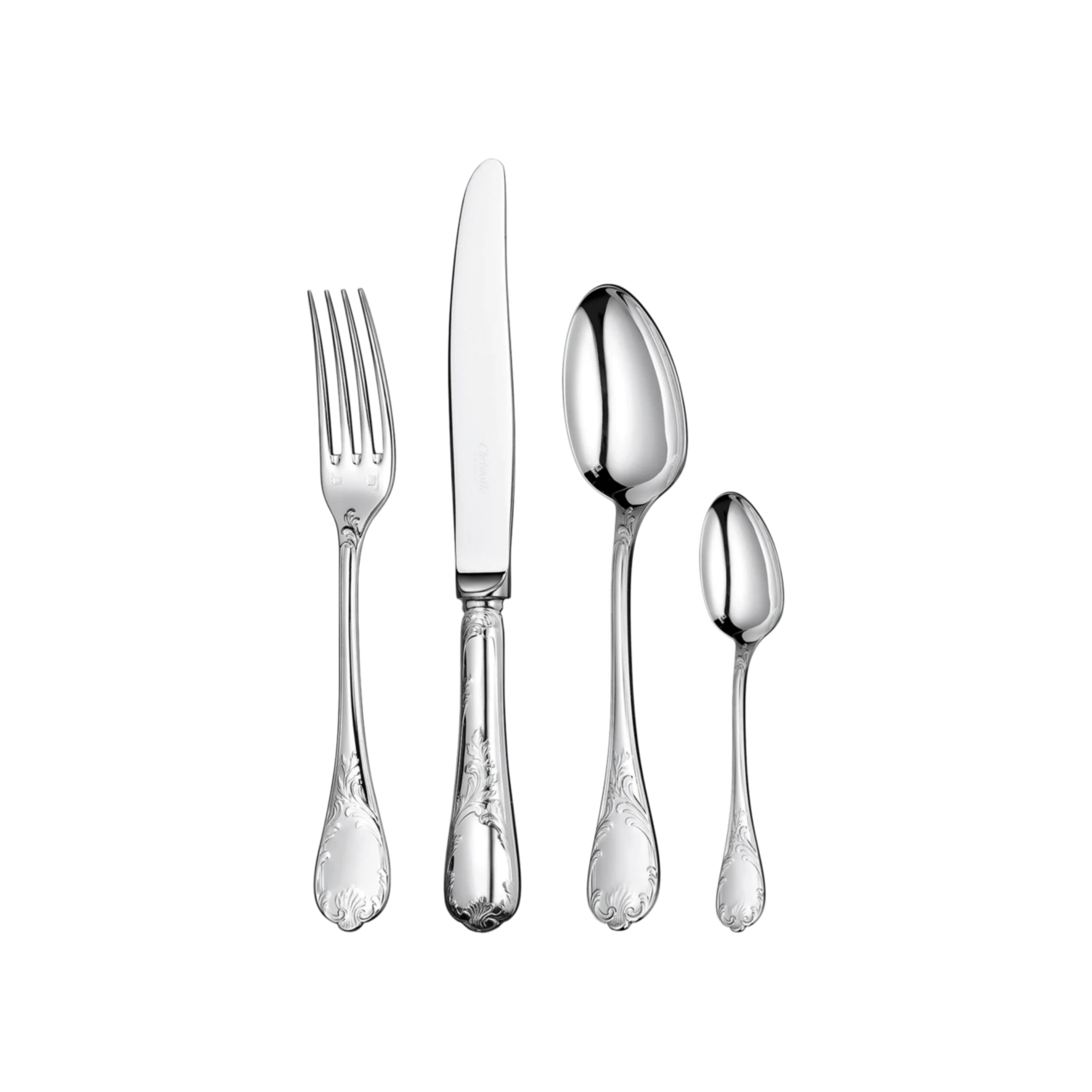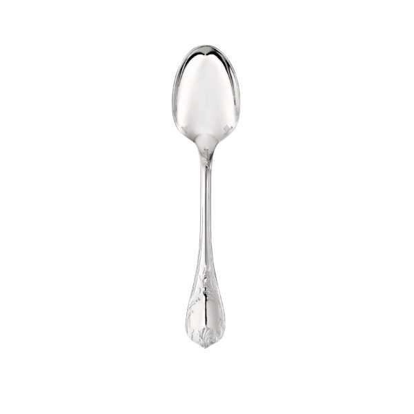 A Silver-plated standard spoon in the Marly pattern Marly, named after a no-longer-standing pleasure palace built by Louis XIV outside Paris, has been one of the most detailed and ornate patterns in the Christofles catalog since it was created in 1897. The fine chasing is an exquisite example of Rocaille with its asymmetrical crawling plant and shell motifs.