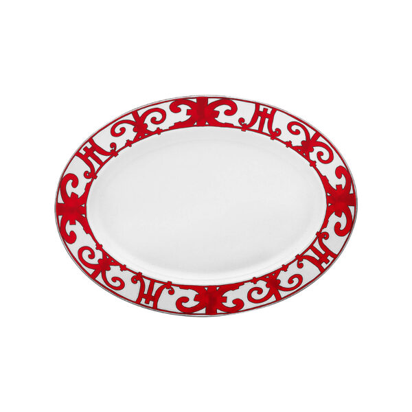 Small oval plateau from Balcon du Guadalquivir collection. The graphic, bold scenery recalls the ironwork of Andalusian towns. The sturdiness of the drawing, the vitality of the colour red, and the wealth and variety of the pieces make it a noble table service.