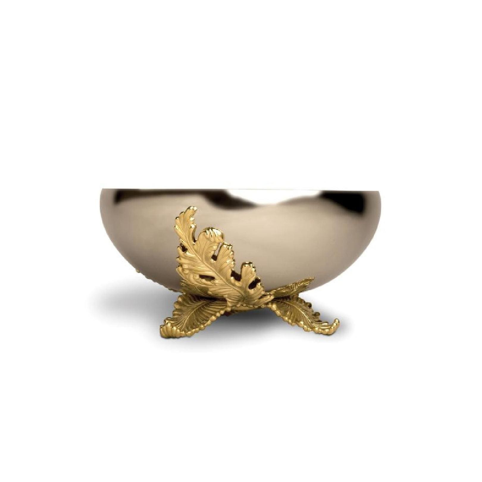 Whimsical and sophisticated, the Lamina bowl combines metalwork reminiscent of French filigree, dramatically offset against contemporary stainless steel, adorned with a handcrafted acanthus leaf motif, sumptuously finished in 24K gold.