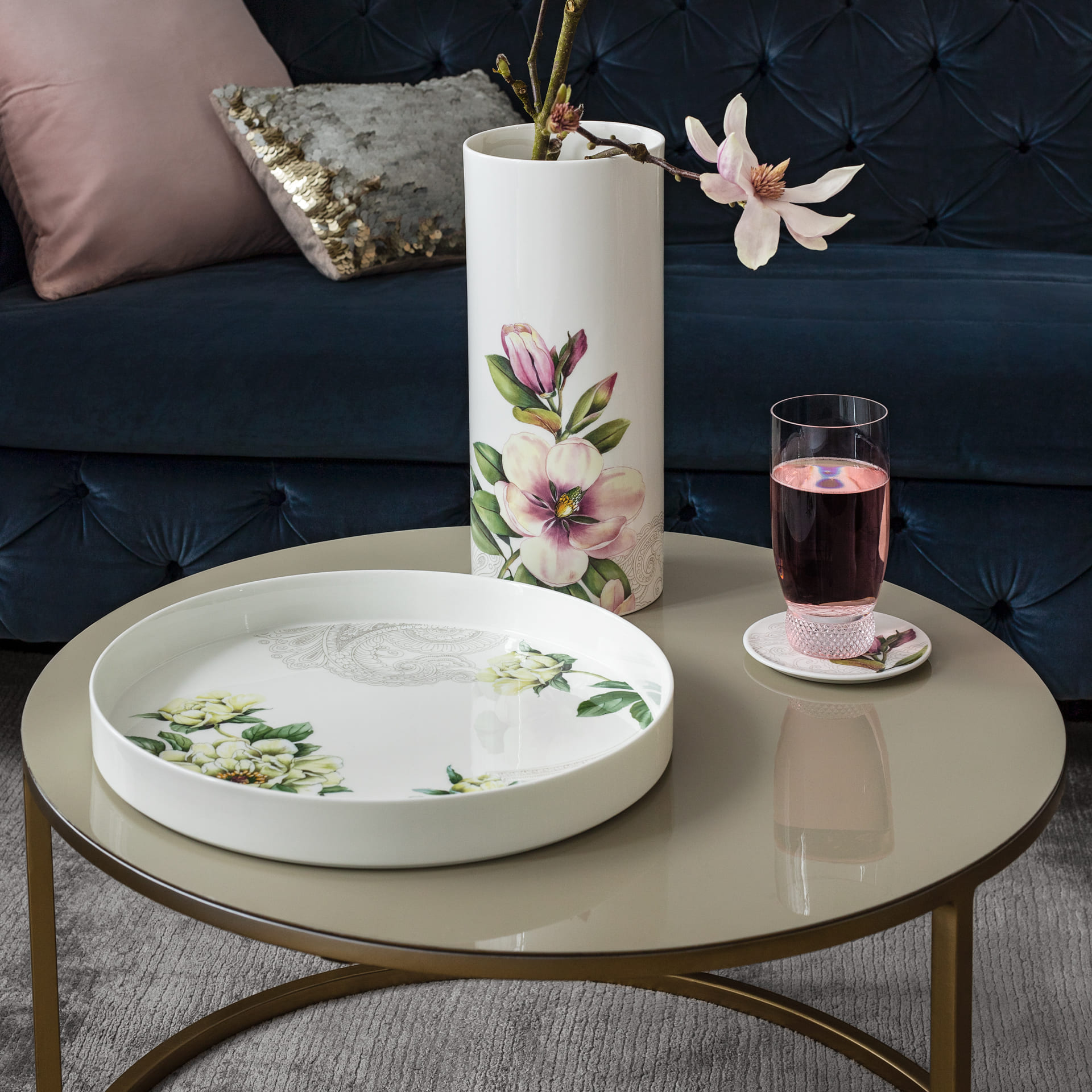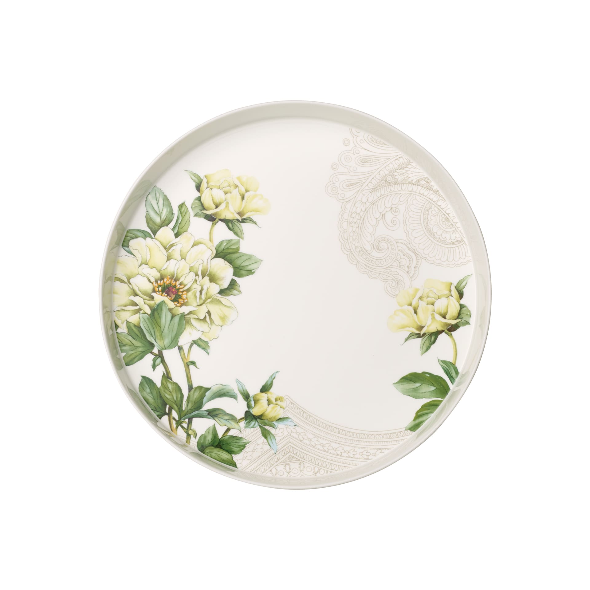 Magnificent highlight. Lush chrysanthemums, delicate camellias, magnificent peonies and beautiful magnolias – the unique flower arrangements in the Quinsai Garden collection are inspired by Marco Polos travels along the Silk Road to his favourite city of Quinsai. The harmonious interaction of colourful and symbolic flowers combined with Indian paisley patterns creates a stylish whole. This flat serving/decorative bowl adds the finishing touch to your beautifully set table and will certainly be put to good use at many of your culinary moments. Experience the floral magic of the Silk Road at home.