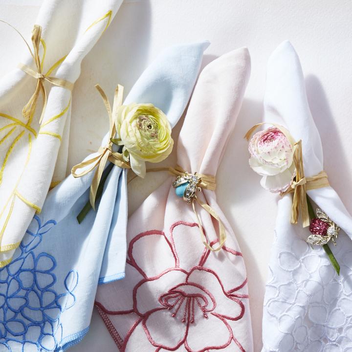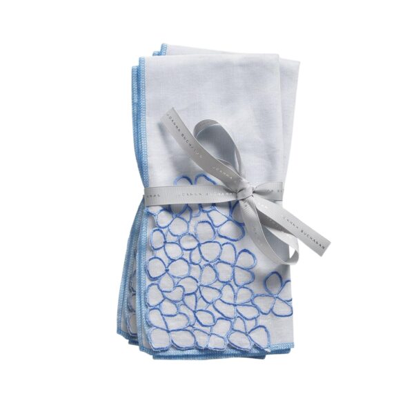 These super special dinner napkins are inspired by the hydrangeas in my garden. I sketched the pattern by hand and then they are embroidered and hand-cut by our artisans in India. These are perfect linen napkins for a garden party brunch or breezy dinner party. Fresh Spring blues… LOVING!