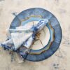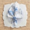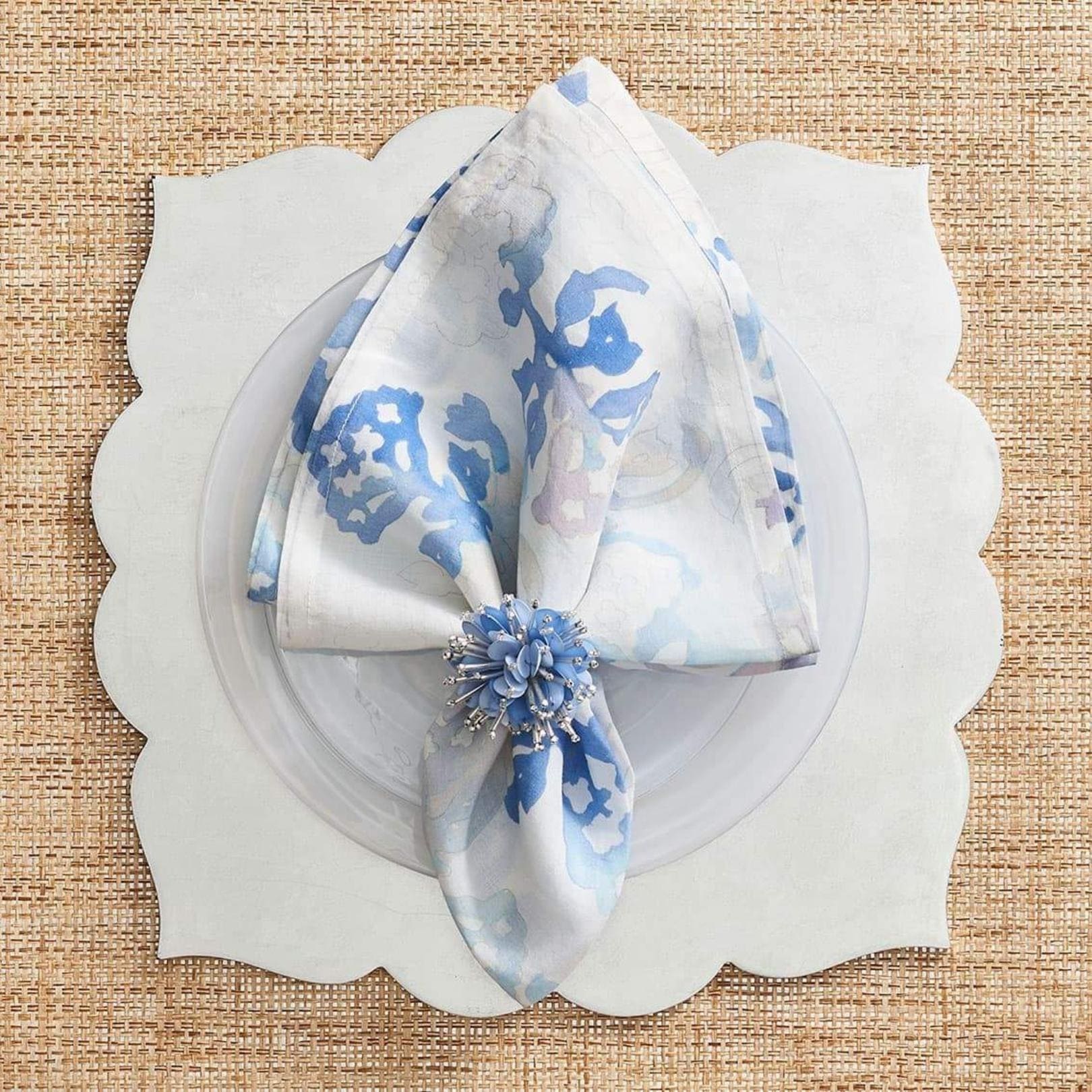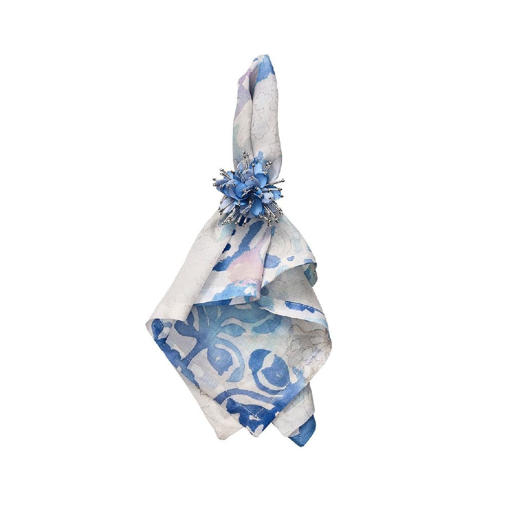 The Watercolor Napkin is a printed cloth napkin showcasing a hand-painted floral motif on linen fabric. This white summery cloth napkin features a fluid watercolor design in blues, pinks and purples.
