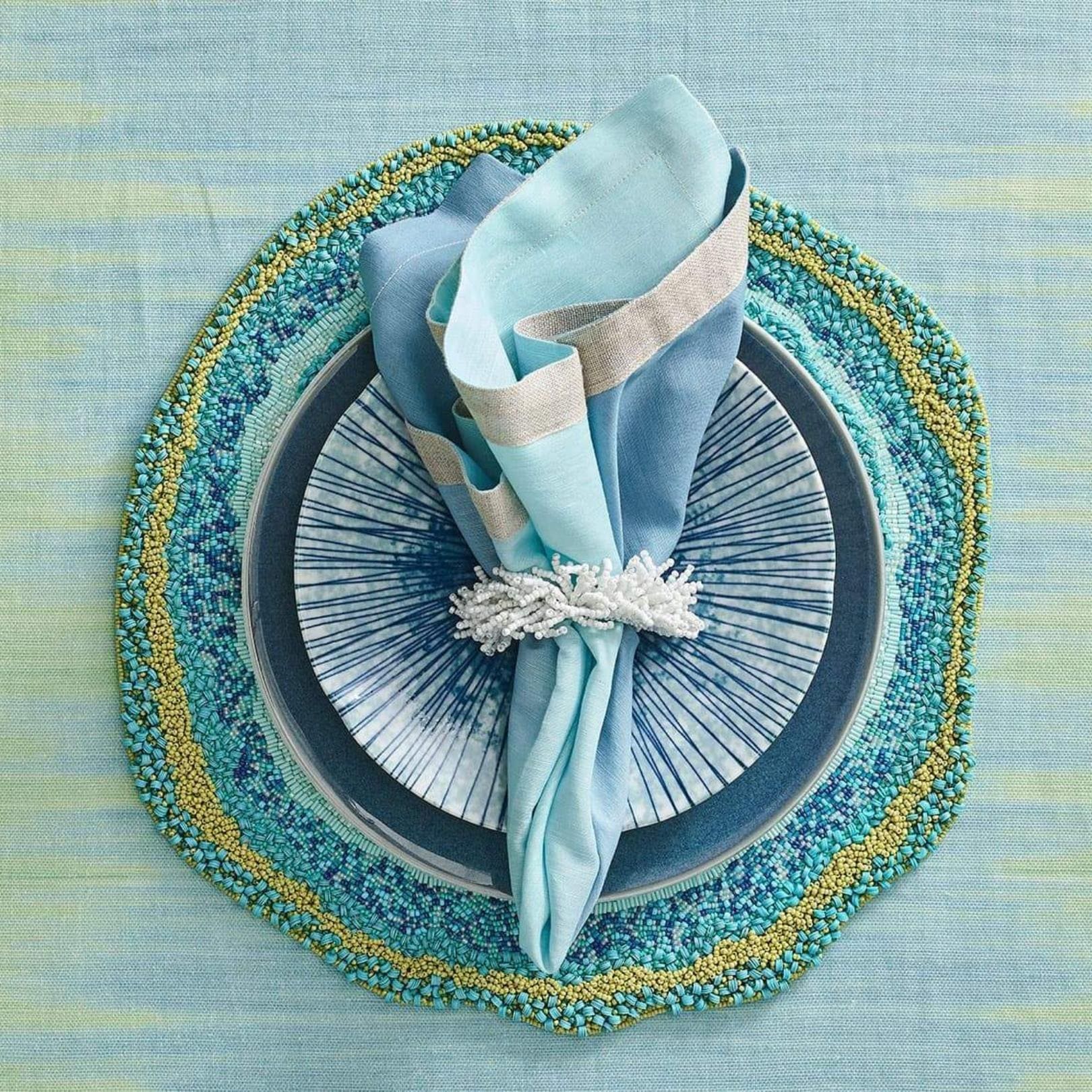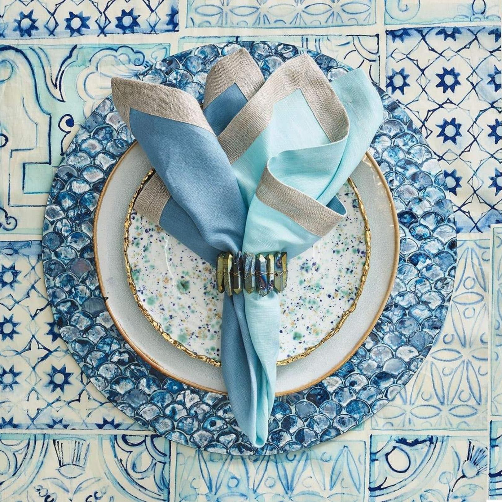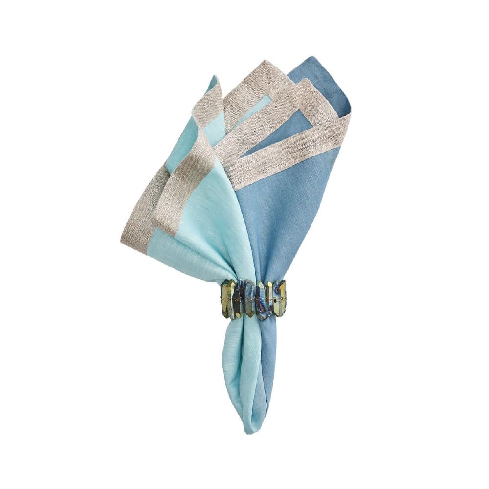 The Dip Dye Napkin from white to a periwinkle blues, adding a subtle elegance to the refined napkin. This gorgeous monochromatic color combination complements any springtime table. These napkins are hand-dipped and dyed and accented with a luxurious metallic foil border.