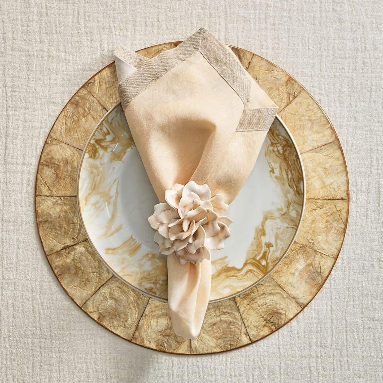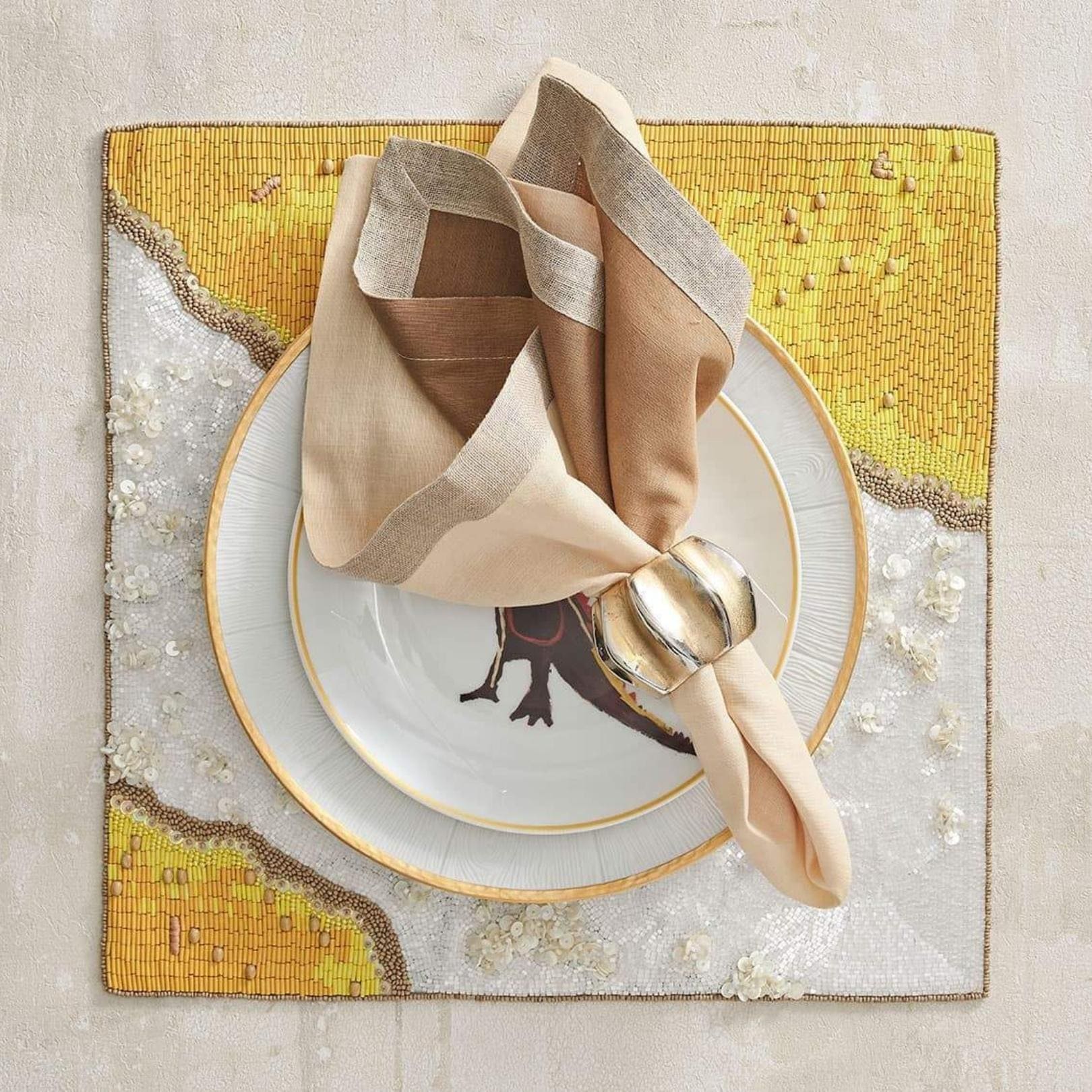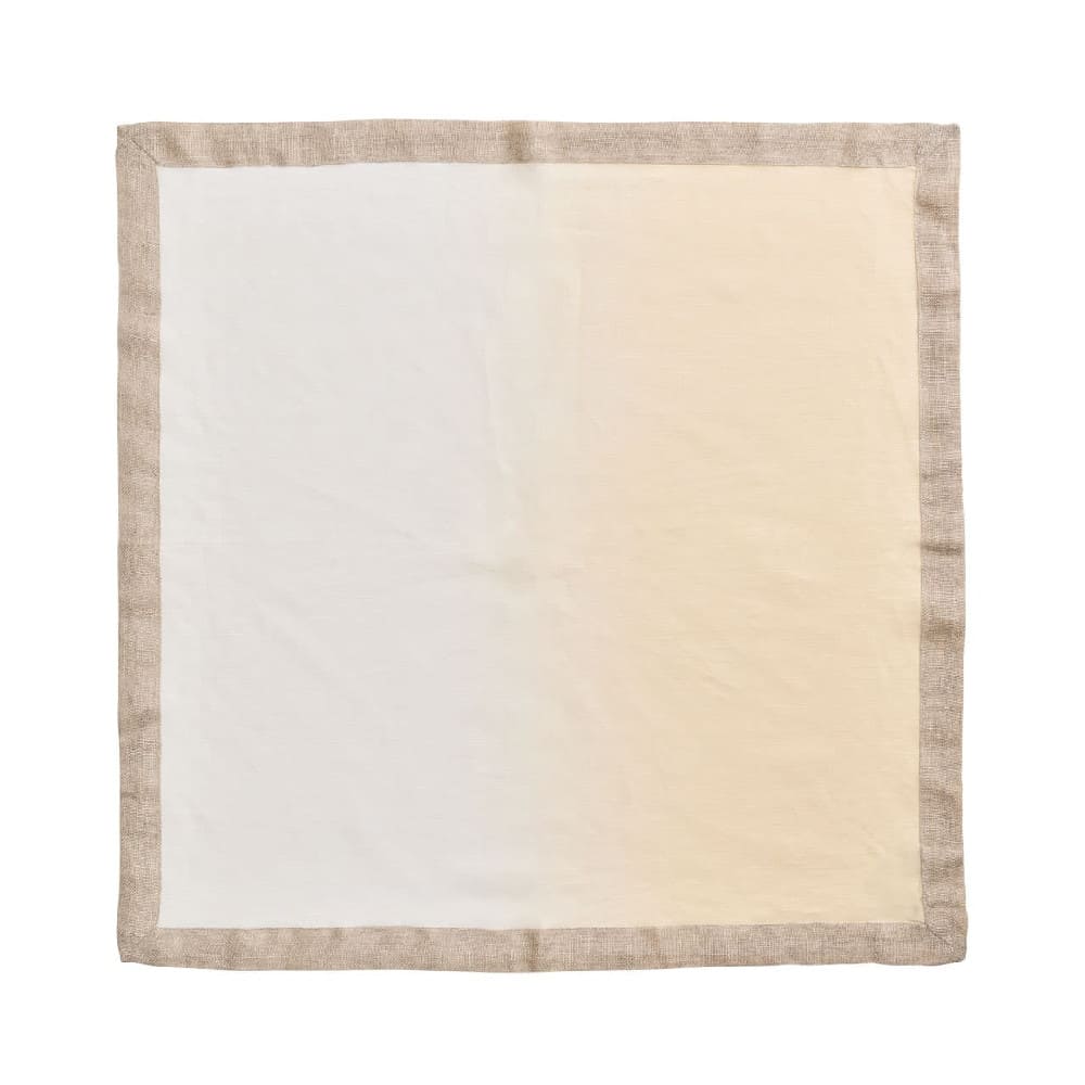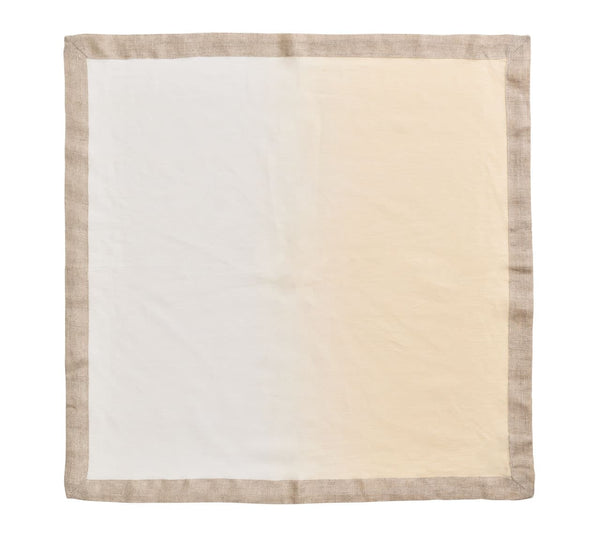 The Dip Dye Napkin features an ombre gradation from white to beige, adding a subtle elegance to the refined napkin. This gorgeous organic color combination complements any springtime table. These napkins are hand-dipped and dyed and accented with a luxurious metallic foil border.