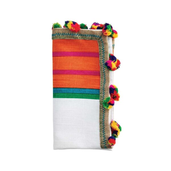 Screen printed stripes get a summery makeover, complete with colorful pom-poms and contrast zig-zag stitching.