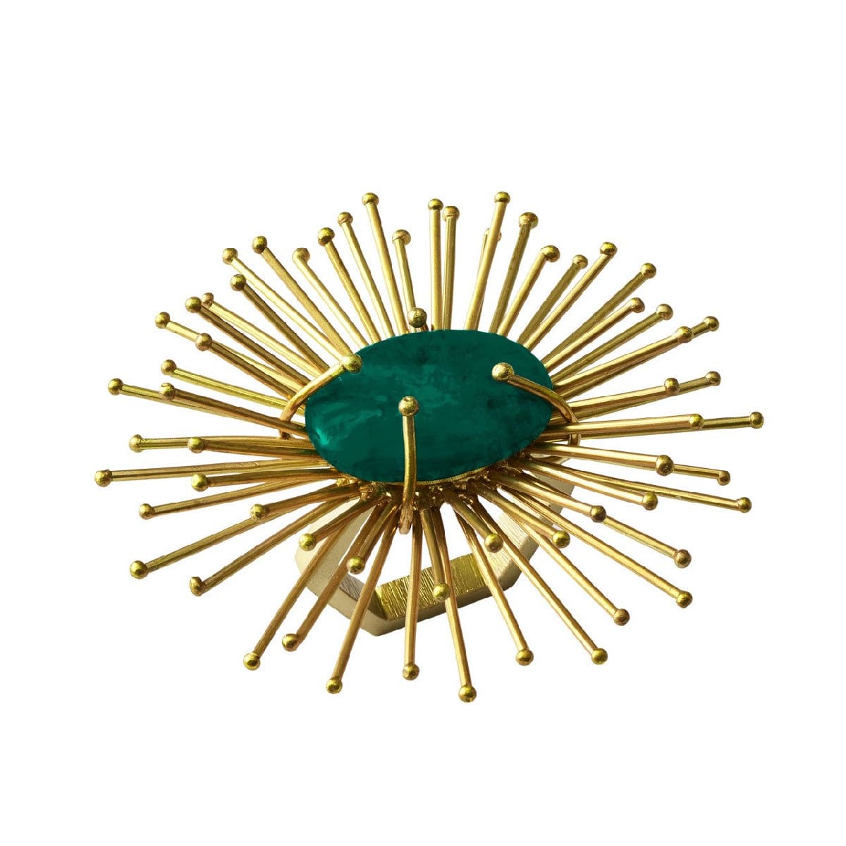 The handmade, brass Flare Napkin Ring is a metallic burst of energy. Each spoke of this gold napkin ring is meticulously welded and bent to create the unique shape. The brass napkin ring features hand-applied metallic paint and quartz and malachite replica center stones. Add a pop of zest to any table with this gold napkin ring.