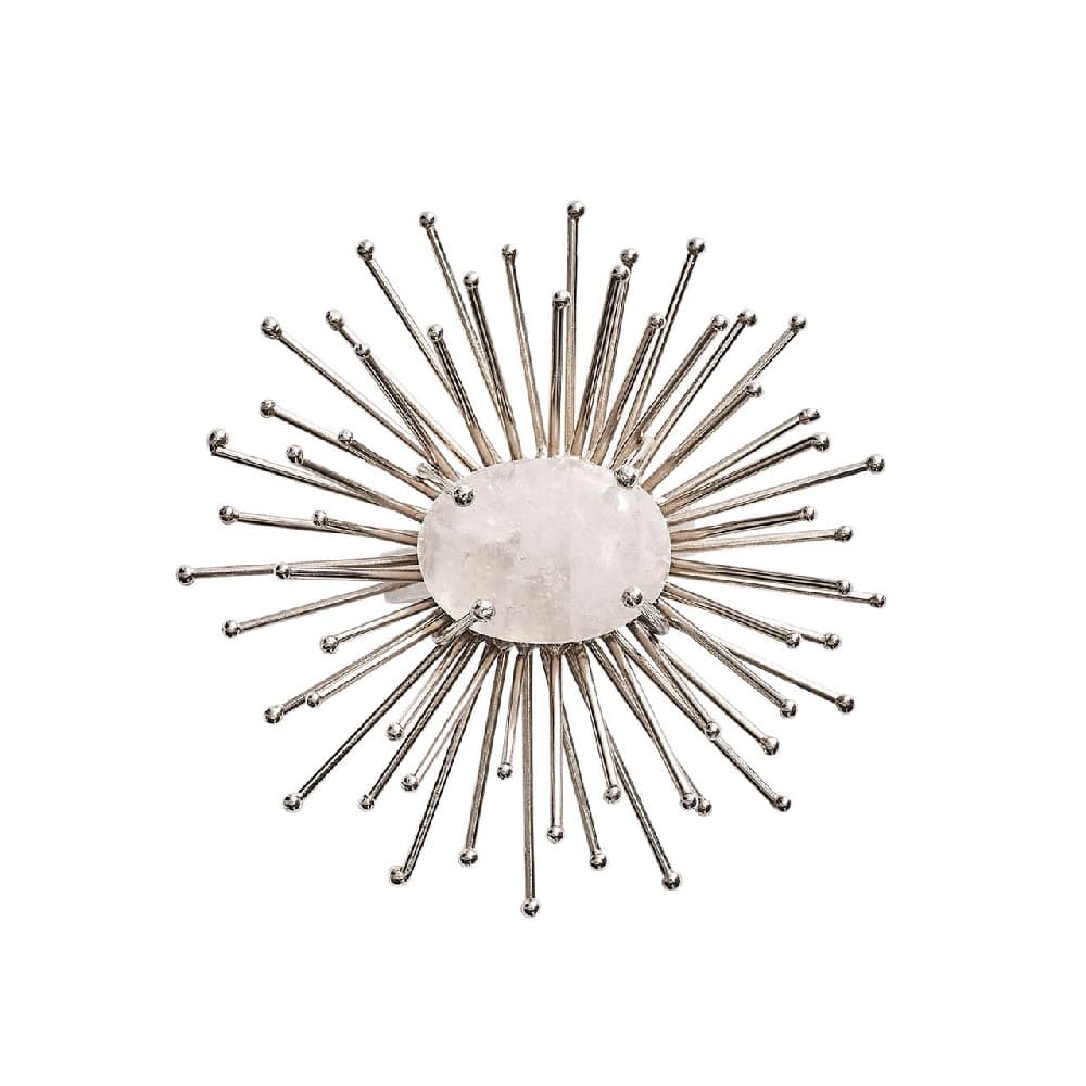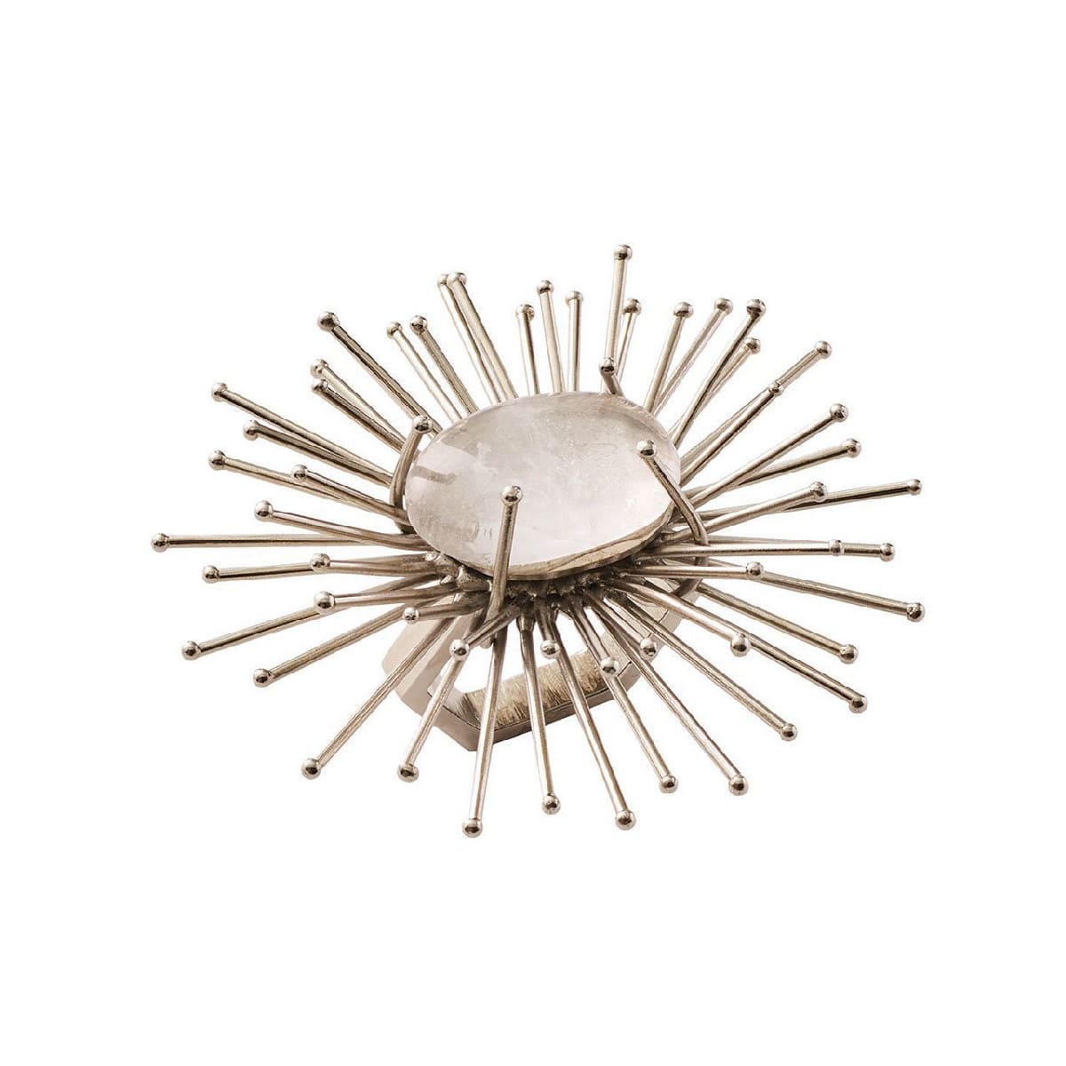 The handmade Flare Napkin Ring is a metallic burst of energy. Each spoke of this silver napkin ring is meticulously welded and bent to create the unique shape. The silver napkin ring features hand-applied metallic paint and quartz and malachite replica center stones. Add a pop of zest to any table with this gold napkin ring.