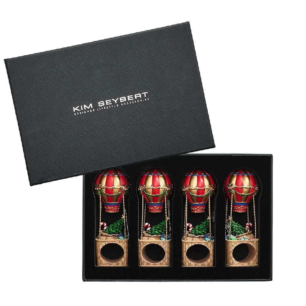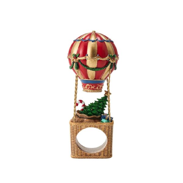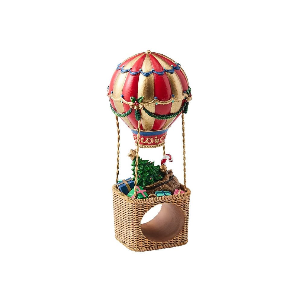 Take a trip down memory lane with the Holiday Balloon Napkin Ring, a nostalgia-inspiring resin hot air balloon filled with perfectly wrapped gifts, a Christmas tree, and favorite childhood sweets. The hand-painted details on the rattan basket and balloons make this napkin ring a work of art.