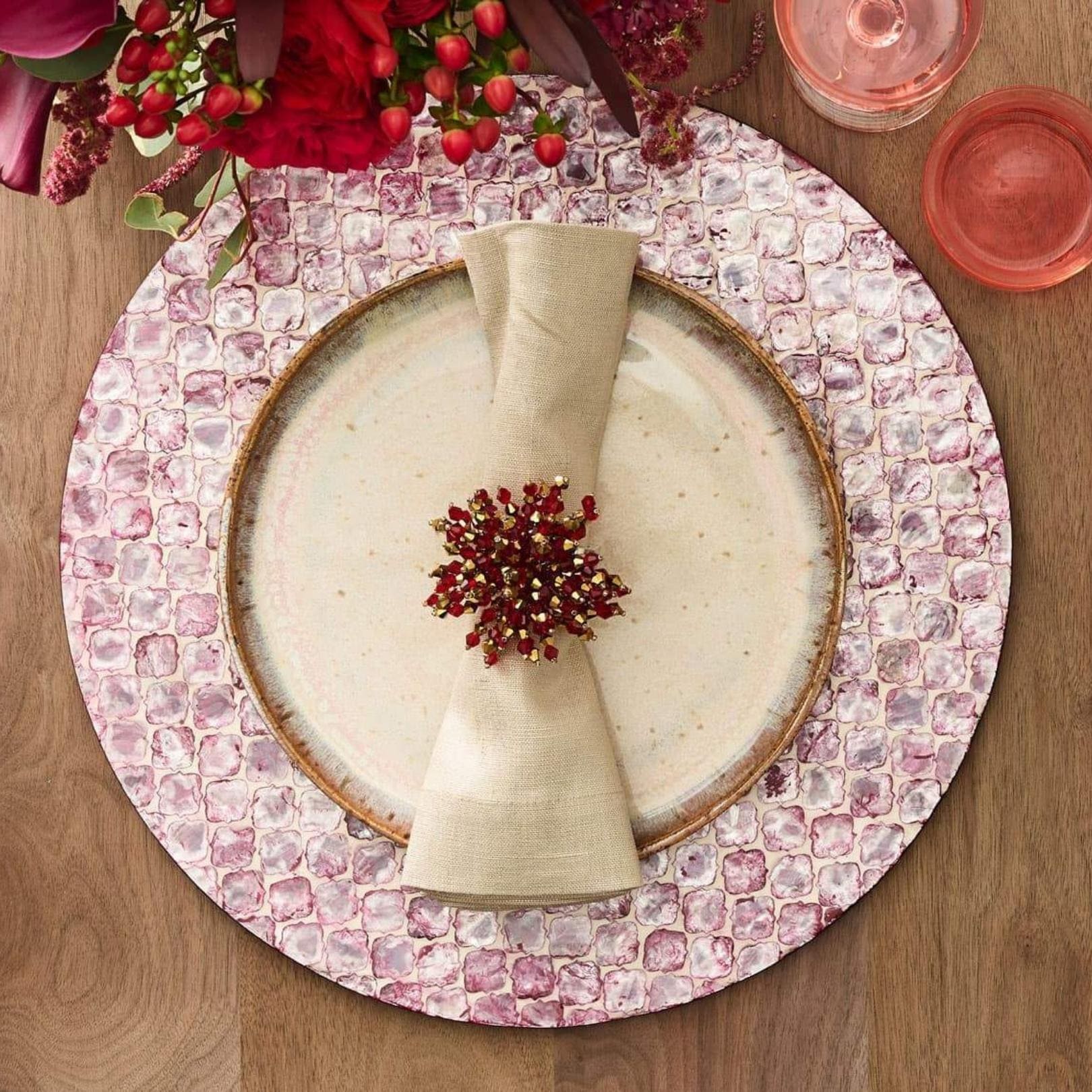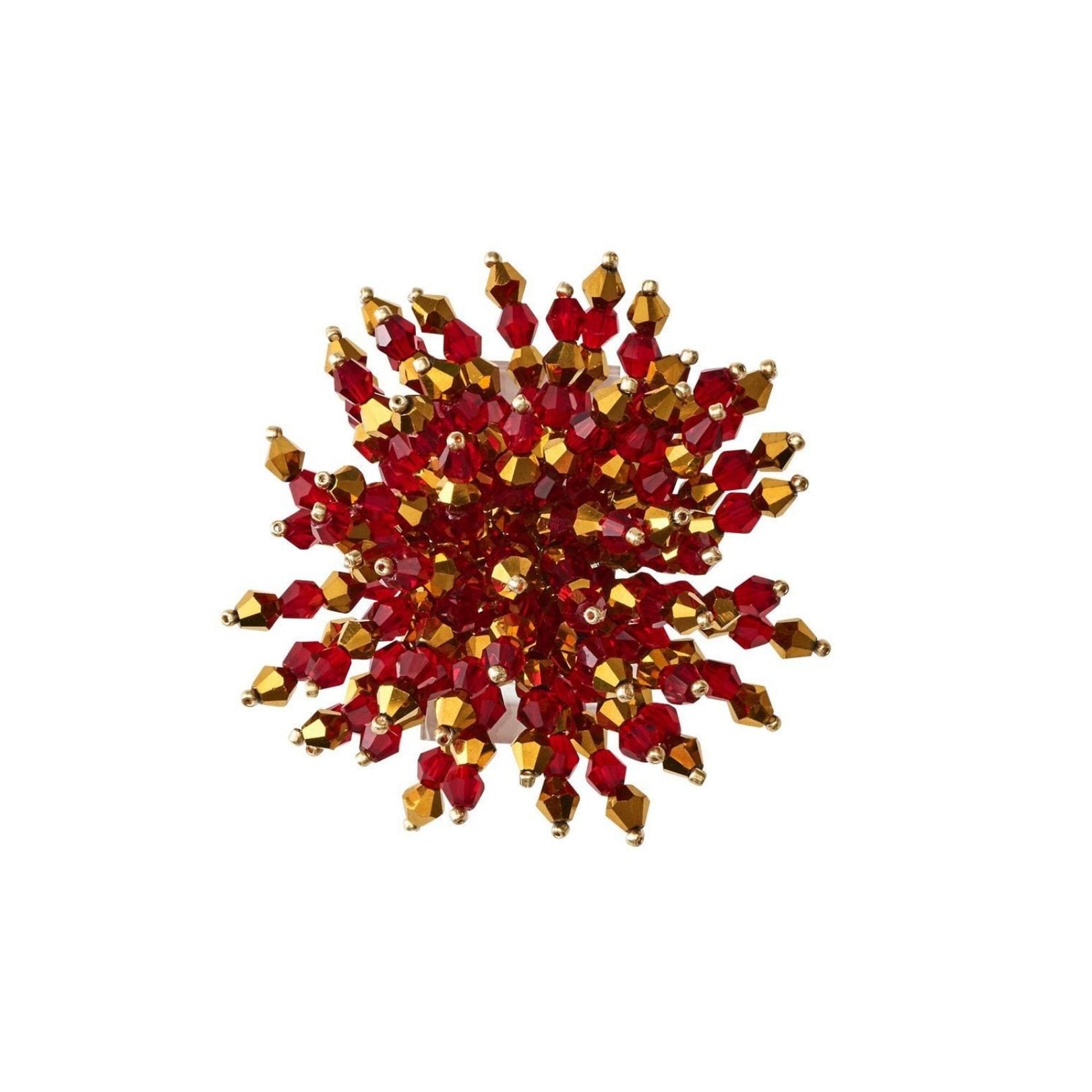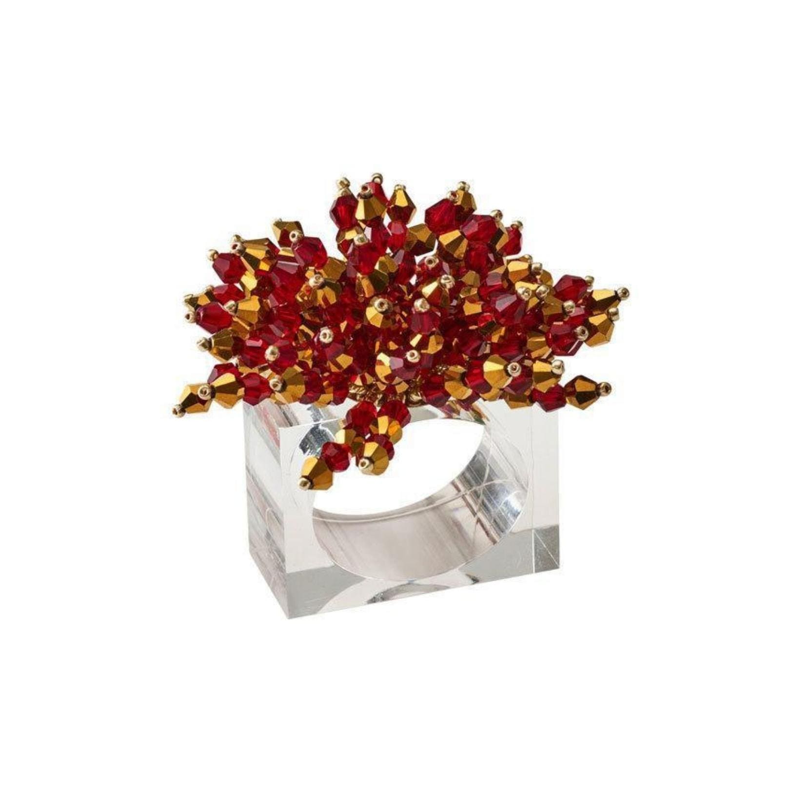 The Brilliant Napkin Ring in red features fire polished glass, acrylic and metal beads. The glistening red napkin ring is hand-crafted, each bead is strung to form a glamorous burst of energy. The perfect napkin ring to accentuate a lavish table or to add sparkle to a more subtle setting.