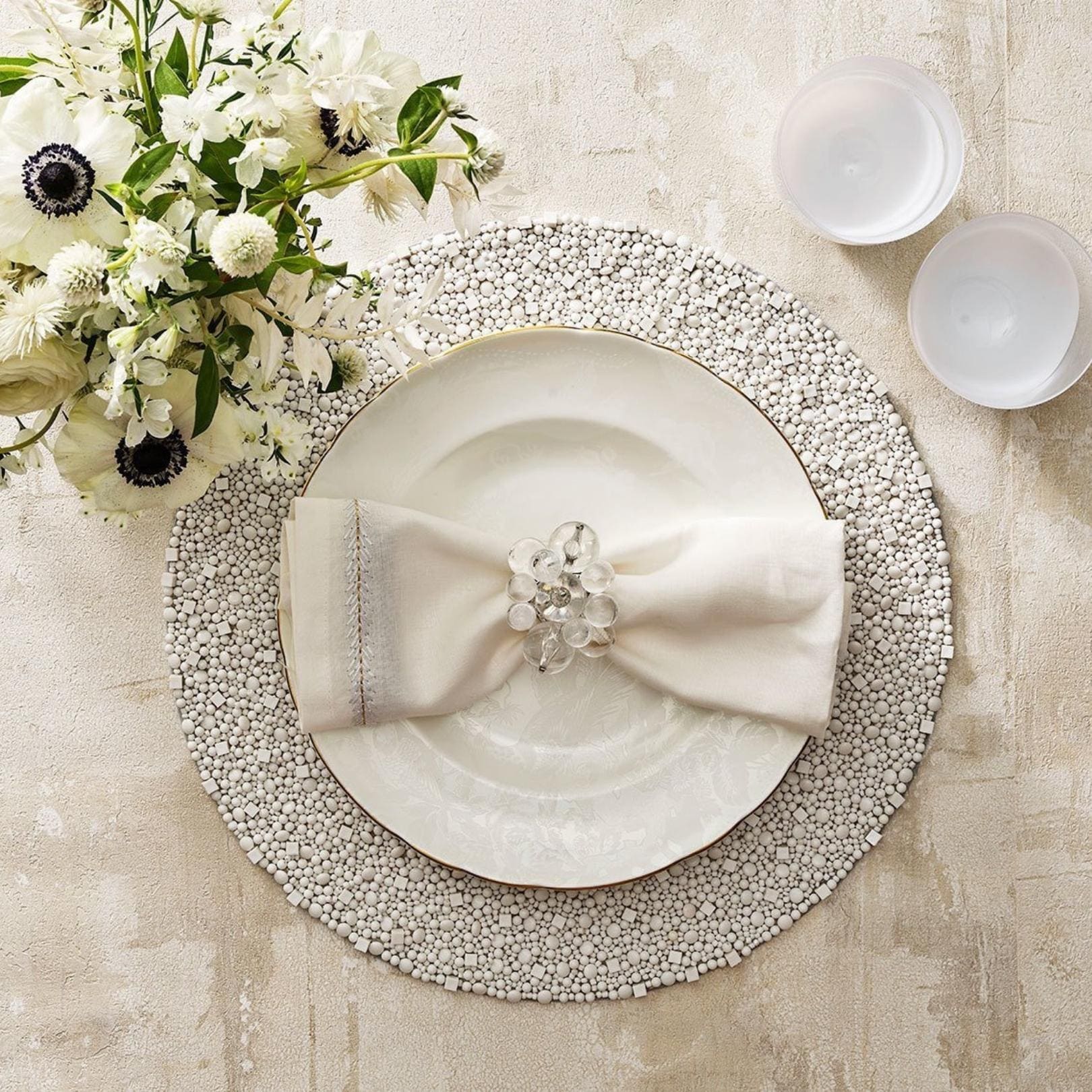 Like jewelry for the table, the Cloud Napkin Ring could be mistaken for a glamorous cocktail ring. This stunning napkin ring features cloud-like acrylic baubles atop a Lucite ring. A perfect addition to any table, the ethereal detail on this napkin ring complements any table.