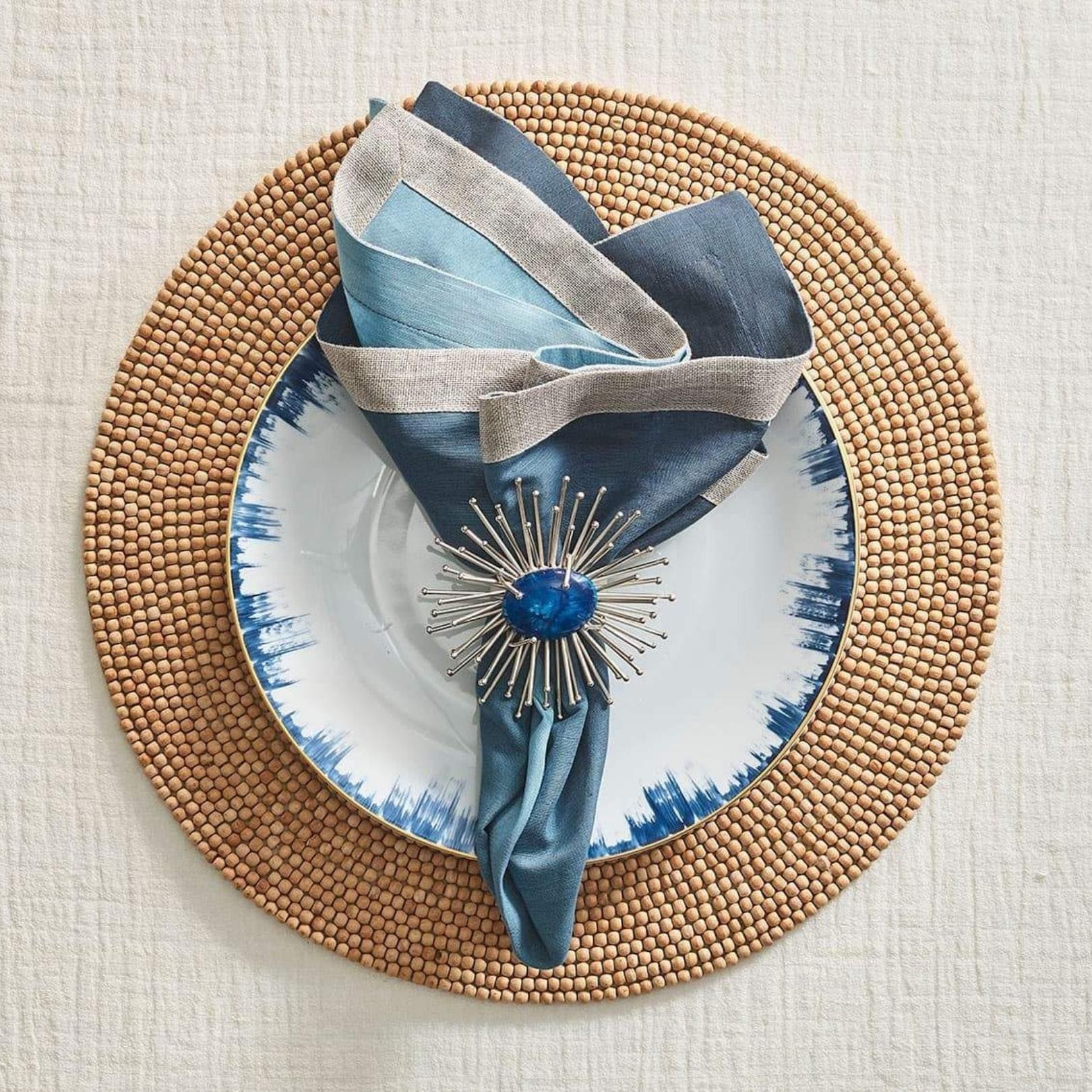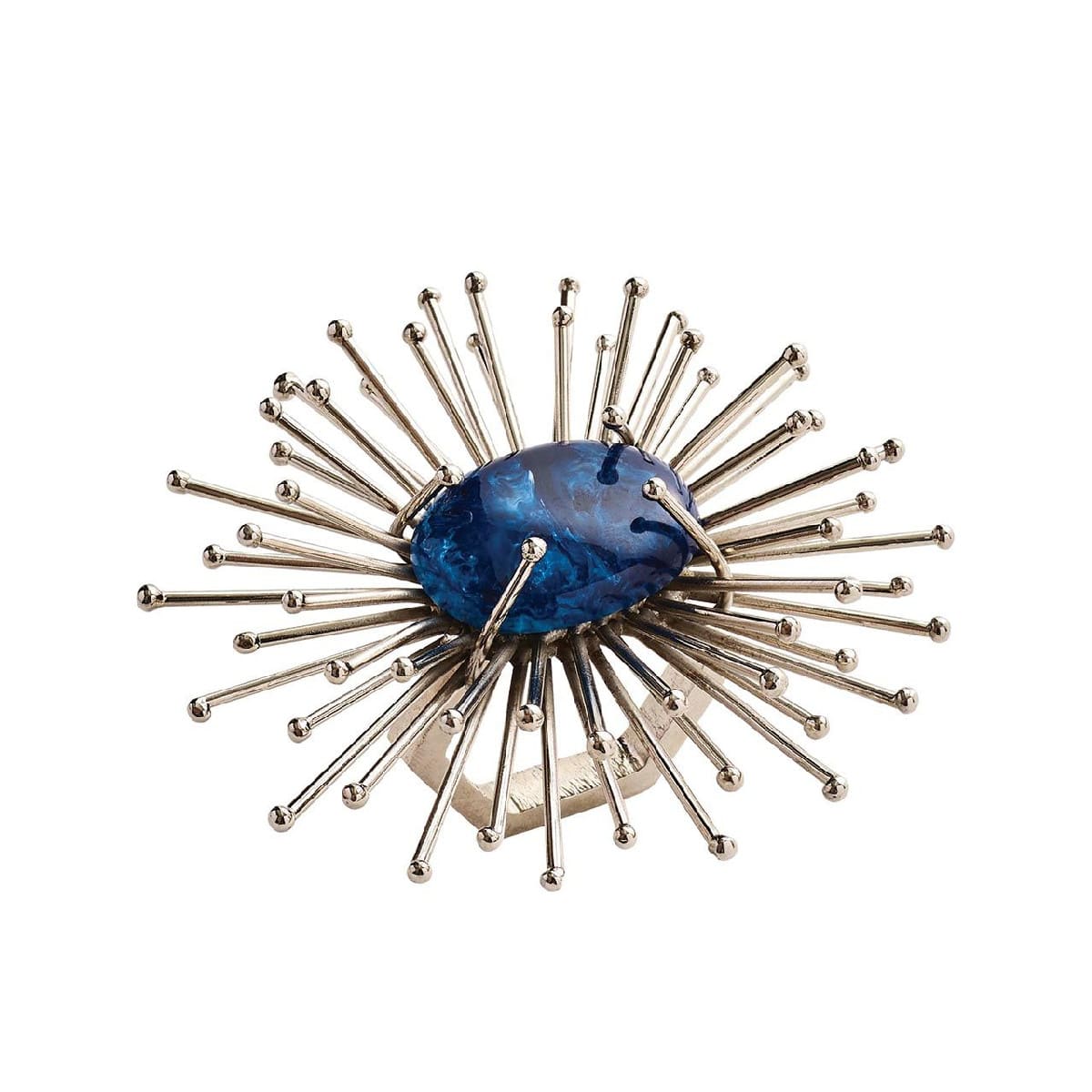 The handmade, silver Flare Napkin Ring is a metallic burst of energy. Each spoke of this silver napkin ring is meticulously welded and bent to create the unique shape. The silver napkin ring features hand-applied metallic paint and quartz and malachite replica center stones. Add a pop of zest to any table with this gold napkin ring.