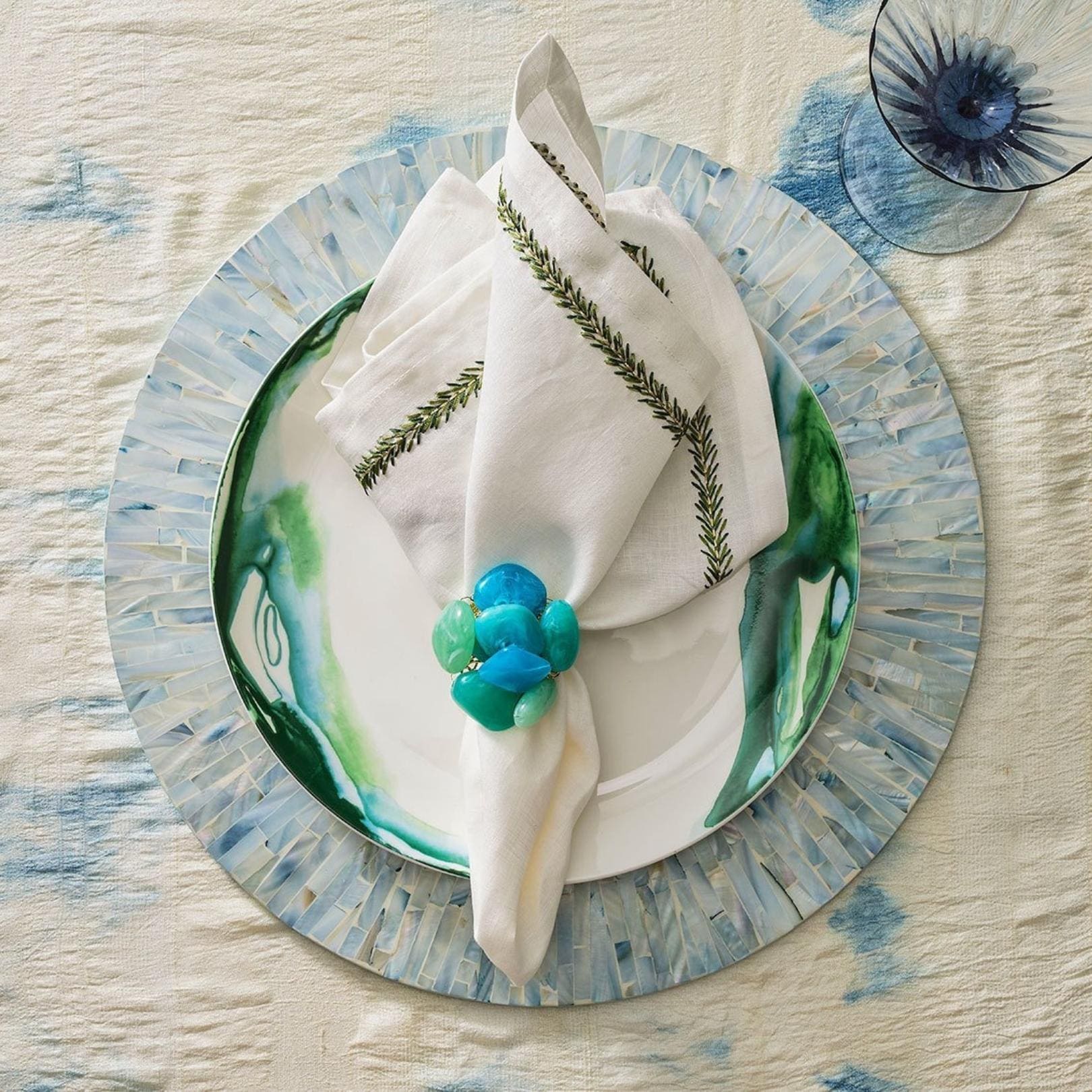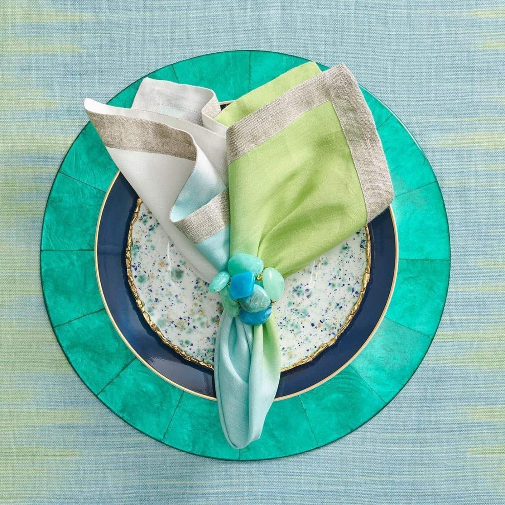 The Sea Stone Napkin Ring in seafoam features aquatic shades of seafoam and teal resin stones set in clusters. These sea-inspired napkin rings are reminiscent of tumbled stones found upon the shore. Arranged at random, the stones are mounted on a beautifully beaded napkin ring. These nautical beaded napkin rings are the perfect addition to a bright and cheery table.