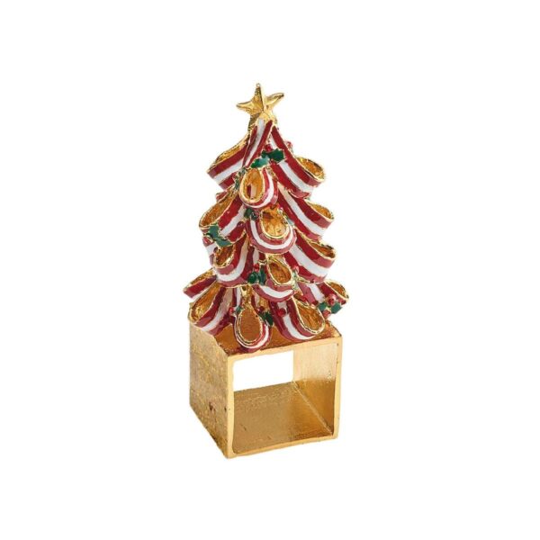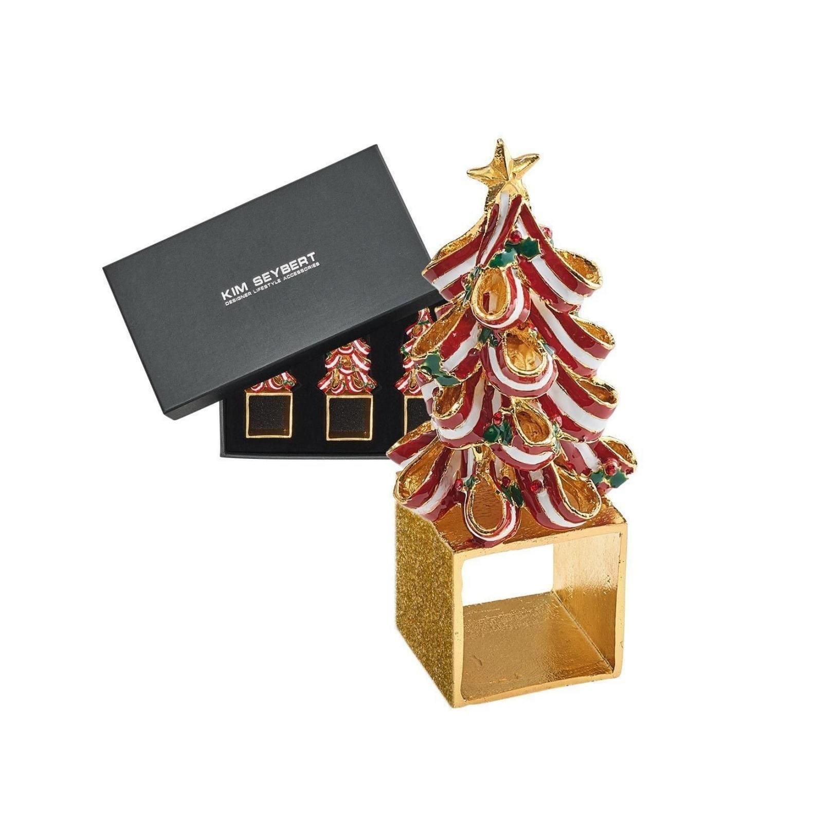 The Holiday Tree Napkin Rings feature ribbons of Christmas candy in red and white with tiny green accent bows set on a gold ring. These Christmas napkin rings are sure to add a whimsical flair to your Christmas table settings. The Holiday Tree Napkin Rings are sold as a set of four.