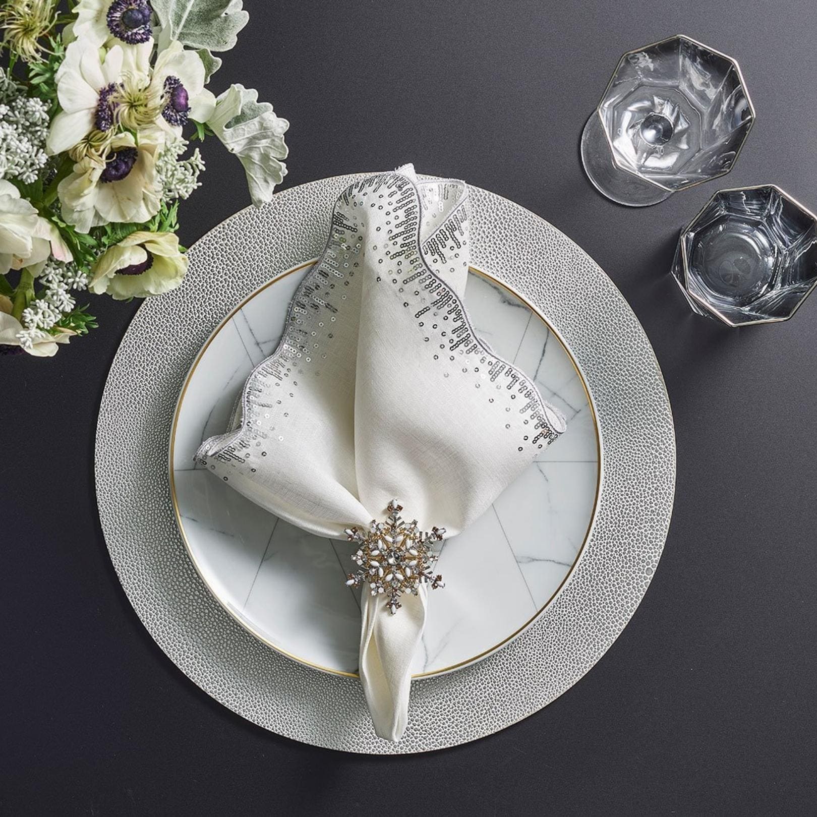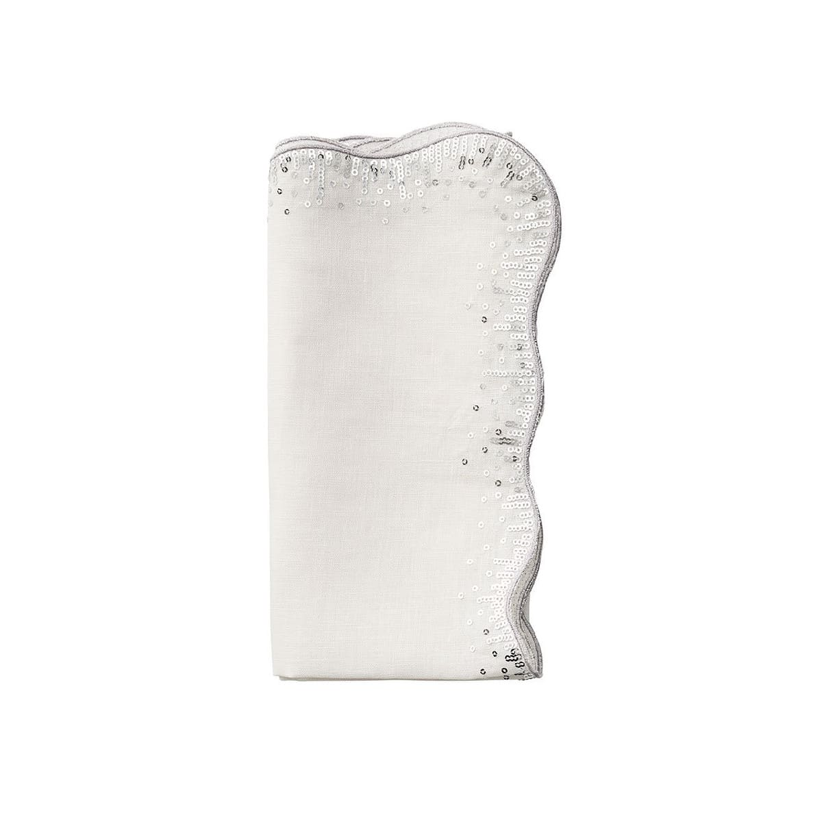 The undulating metallic silver sequins on the Sequin Spray Napkin create a festive effect on the crisp white linen background. A festive approach to a classic napkin, the Sequin Spray adds a touch of elegance to any holiday table.