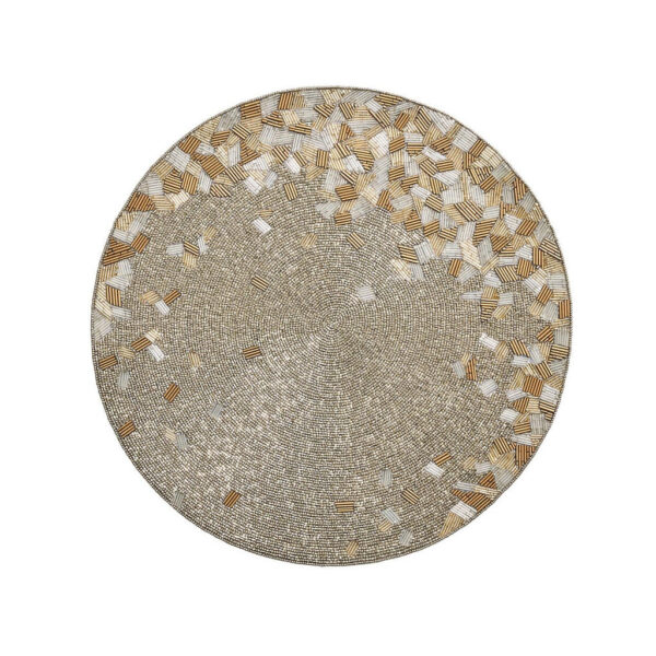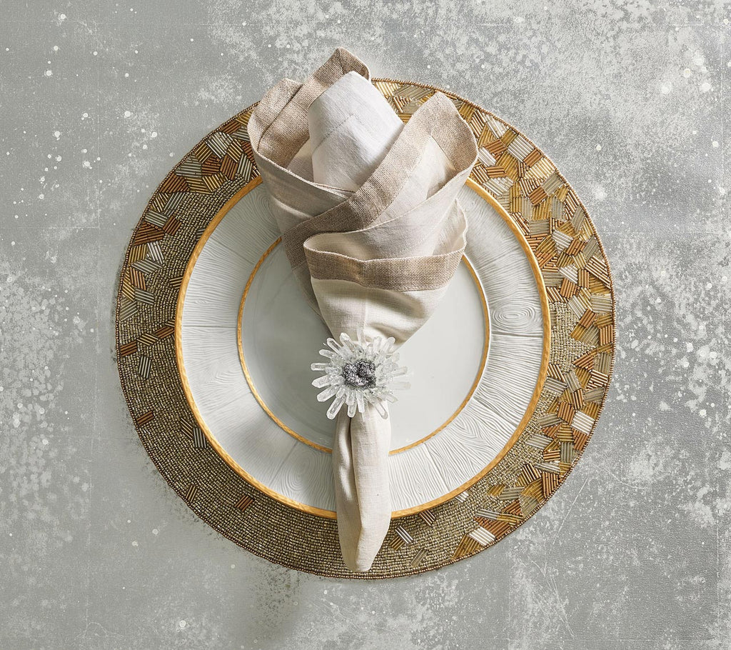 The Abstract Placemat is a modern beaded round placemat featuring exquisitely detailed beading. The placemats, available in gold and silver, are inspired by twinkling lights. This glass beaded placemat includes glass bugle beads cut in a variety of lengths and angles creating facets that radiate light. These round placemats set the stage for a stunning formal and celebratory tablescape.