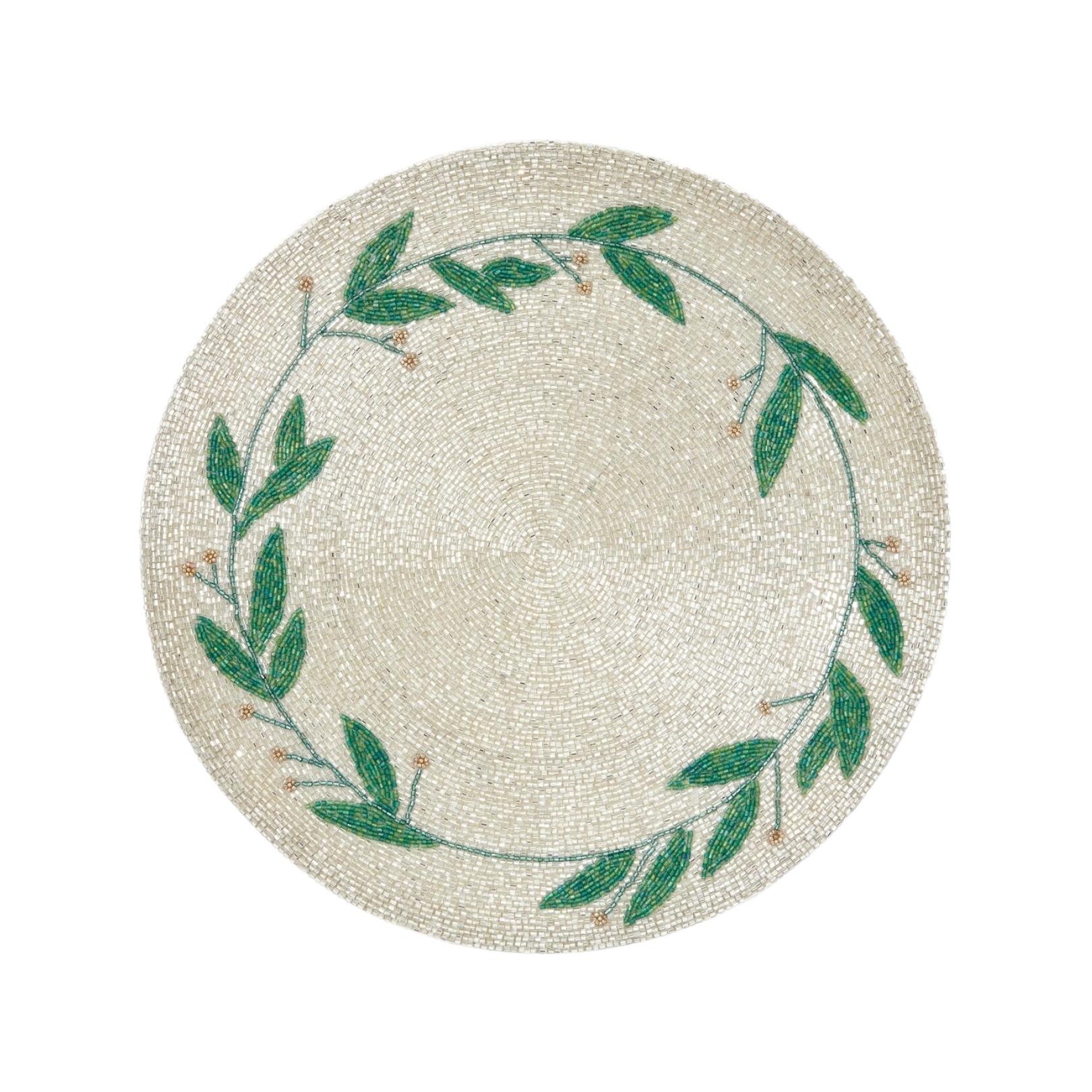 These stunning mistletoe placemats are the perfect base for your Holiday tablescape. Inspired by some mistletoe in my garden that I use for greenery on our Christmas table, I sketched this delicate crown of mistletoe and had our artisans in India hand-bead these mats in clear, green, and gold glass beads. These are so special to me and are sure to become a treasured part of your Holiday decor traditions!