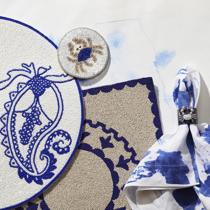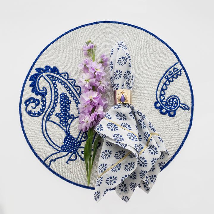 Blue and white is always in style! This placemat with detailed paisley motif will be the foundation for a striking tablescape. Pair with our patterned napkins and any of bug or shell rings for a place setting your guests will be raving about!