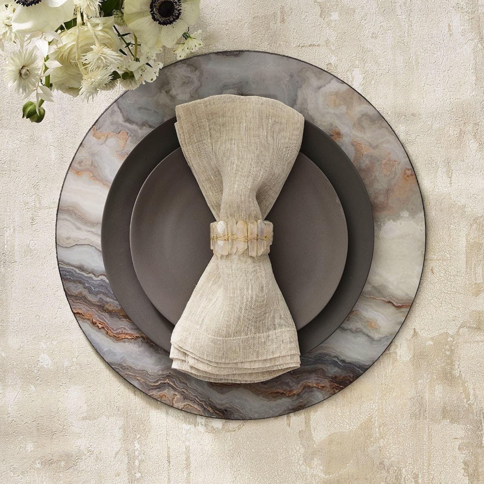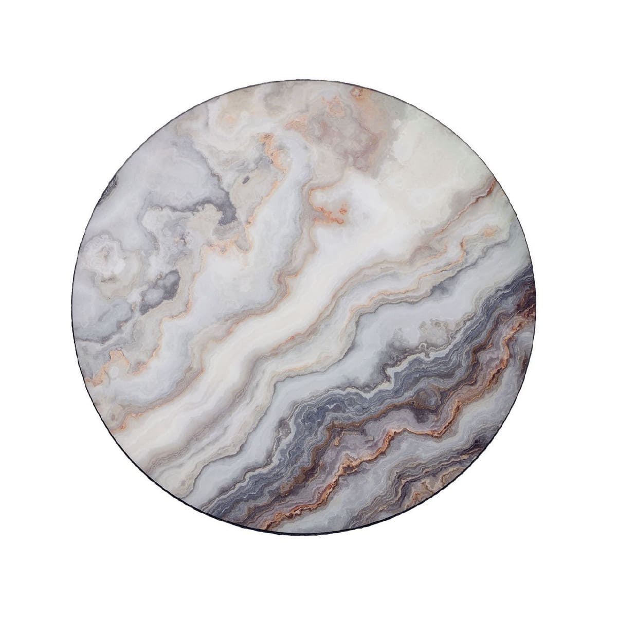 Agate, a compilation of rock crystals and quartz, is regarded for its healing properties. The Agate Placemat is modeled after a slab of Agate found in Sicily, where the crystal was first discovered. The design is printed on acrylic and backed with cork for protection.