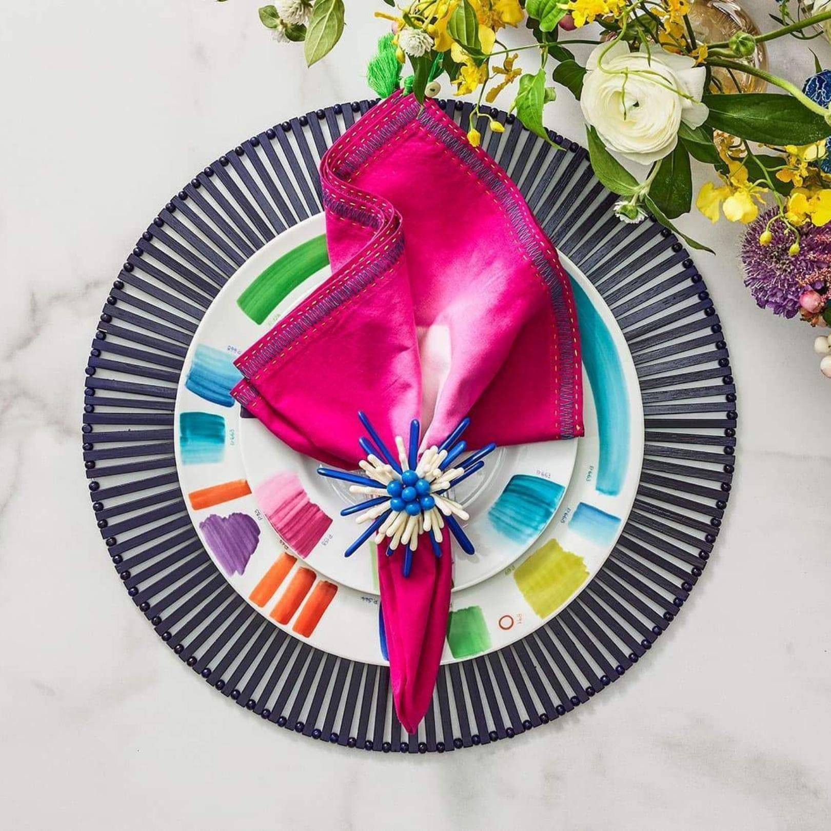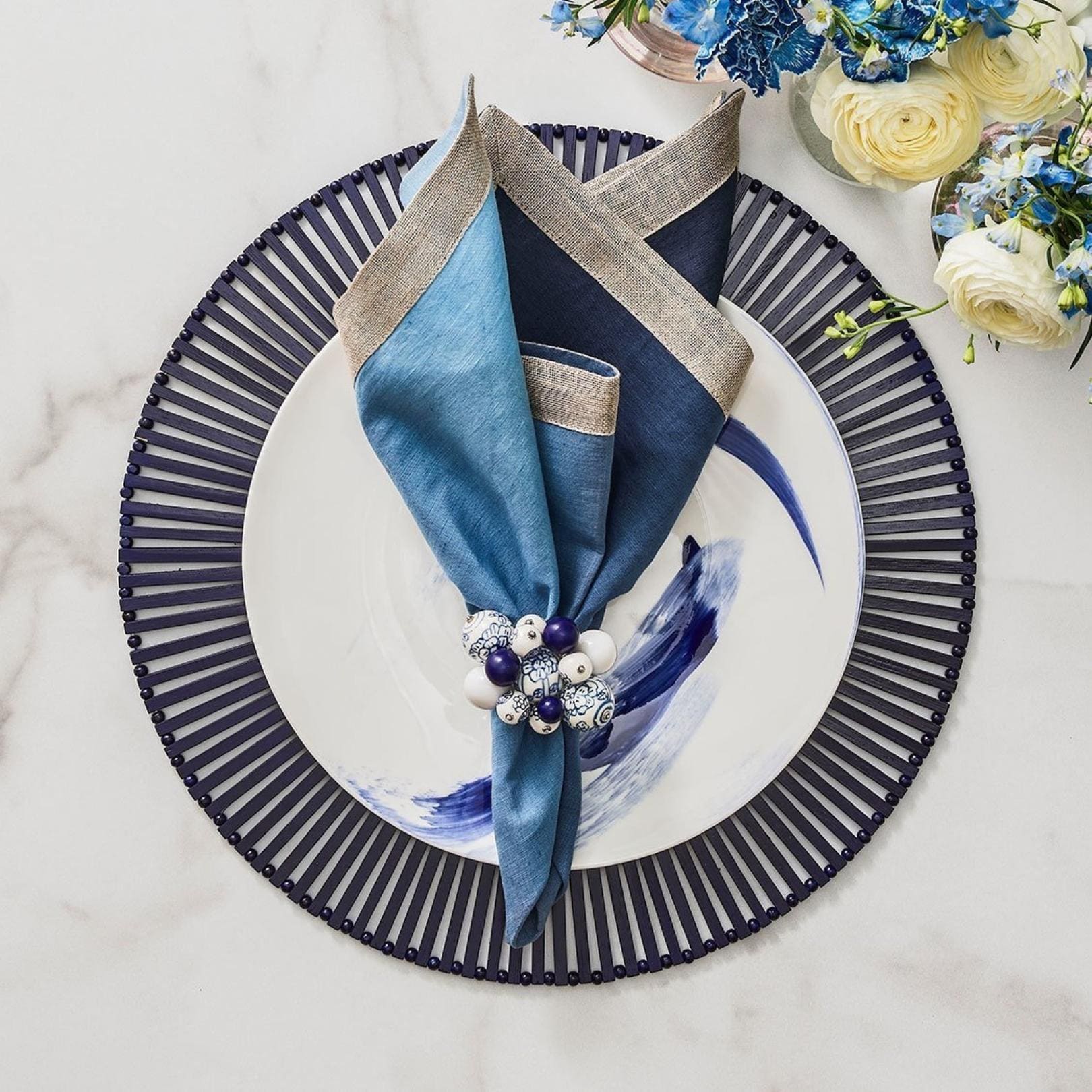 The round Spoke Placemat in navy is a nod to the Eastern world with its hand-cut bamboo slats arranged in a geometric pattern. The bamboo slats are arranged by hand in this round bamboo placemat making it the perfect blend of clean, refined lines and natural organic elements. This navy bamboo placemat works well in any table setting from casual to refined dinners. Sold in sets of four placemats.