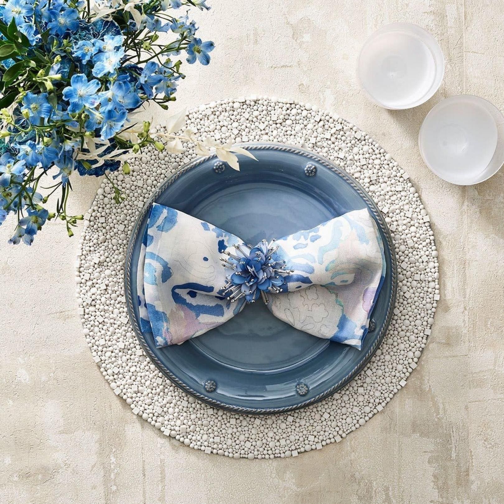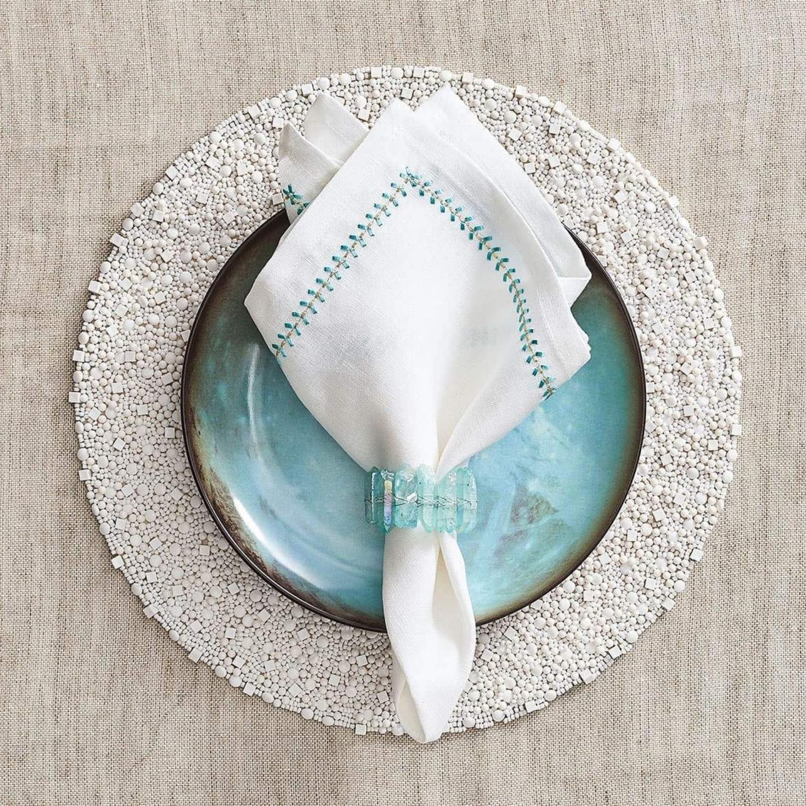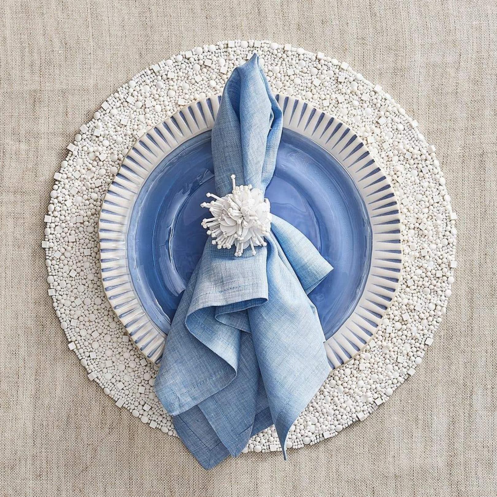 Inspired by the coastal seashore, the textural elements of the Bianco Placemat mimic that of elusive rocky cliffs. The intricate combination of white beads creates a tactile as well as visual experience. While the design is complex, the monochromatic nature creates a neutral yet striking backdrop.