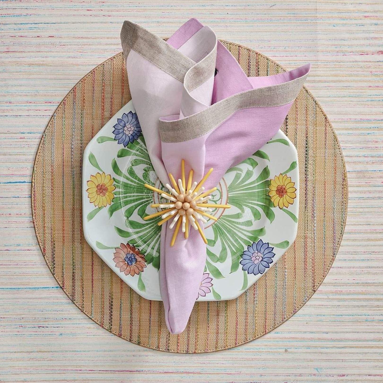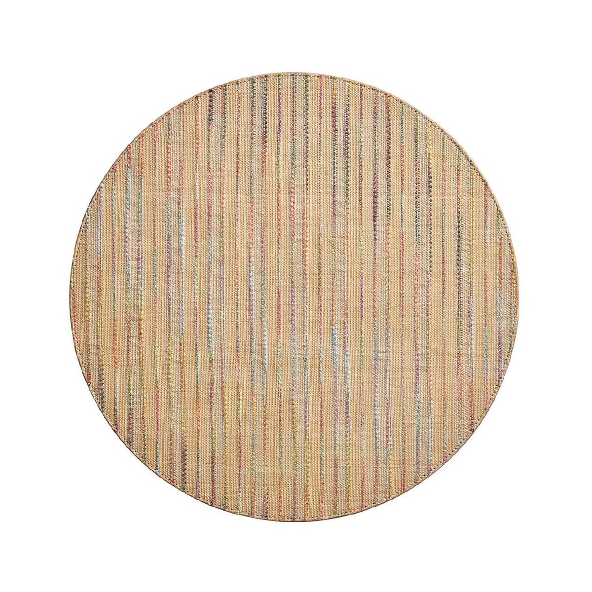 Inspired by the burgeoning colors found outside, the round Frolic Placemat combines stunning vibrant design with entertaining ease. The round, woven Frolic Placemat features a linear pattern with pops of festive colors. Created using vinyl that mimics the look of multi-colored yarn gives this versatile round placemat the texture and depth of a raffia-like fabric with the ease of cleaning.