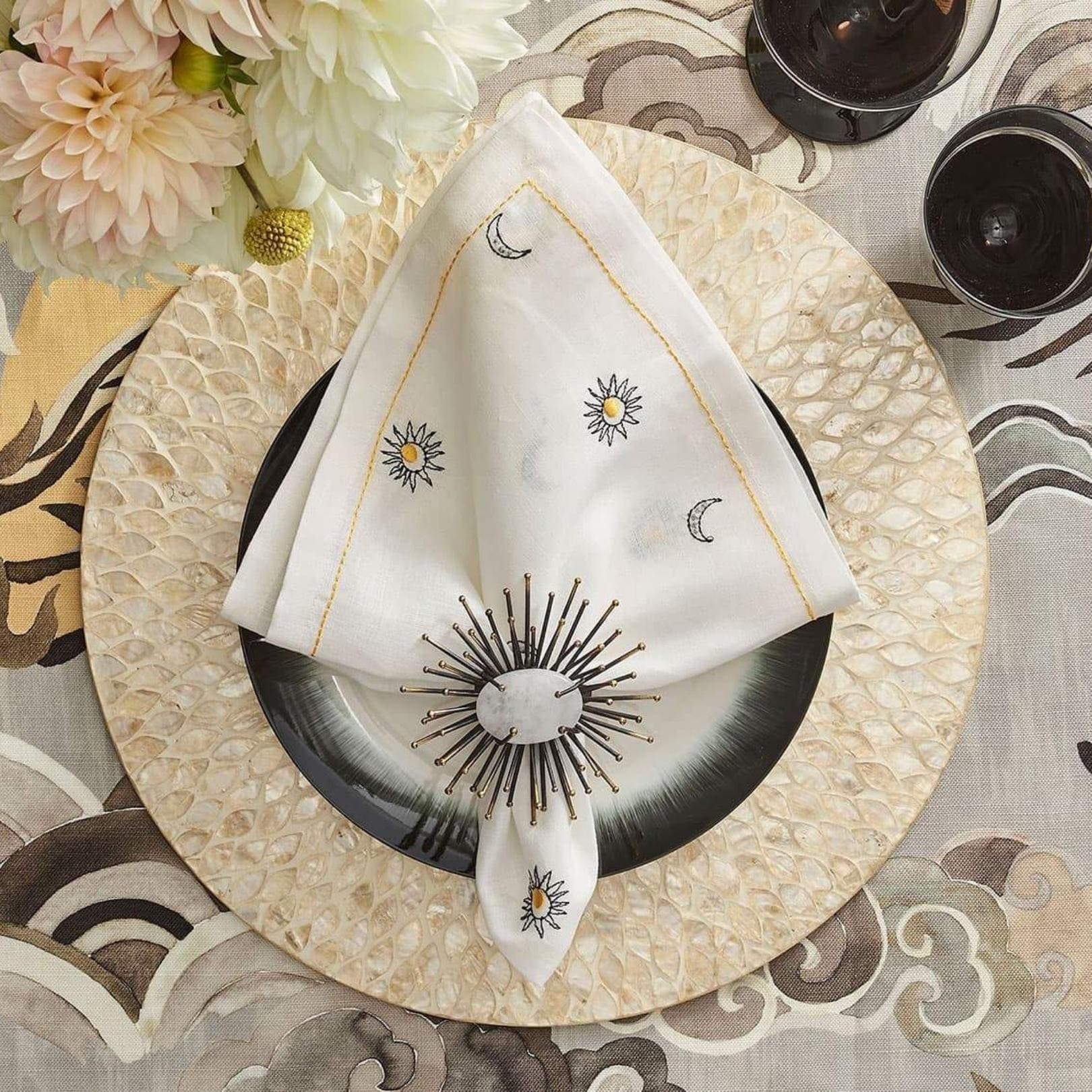 Perfect for a midsummer soiree the round, gold Marquis Placemat is a sophisticated take on summer entertaining, embracing subtle golds and champagnes. Featuring capiz shell that are cooked in a unique process to obtain a golden hue, then hand-cut and inlaid in a radiating pattern to form the round Marquis Placemat. This solely hand-crafted placemat allows for variation, each placemat is one-of-a-kind.