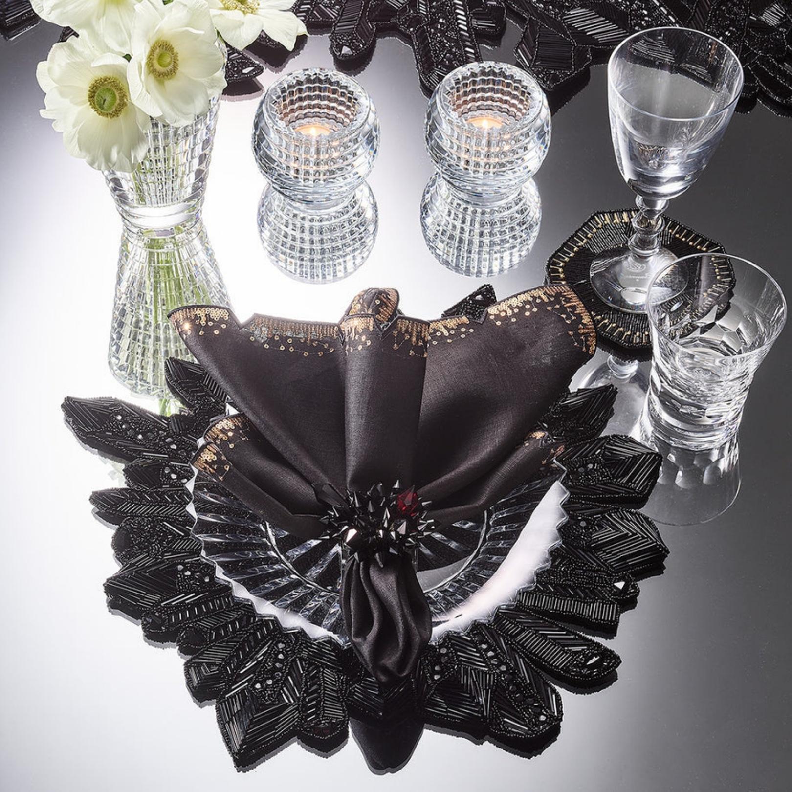Influenced by the Zenith chandelier’s structure and ornamentation, the beaded Baccarat x Kim Seybert Zenith Placemat is a truly decorative piece. Intricate 3-dimensional beading techniques are used to create a magnified crystalized pattern. This sculptural pattern of the Zenith Placemat produces a crystalline structure with depth and movement. Glass and crystal gemstones adorn this sophisticated placemat and add an element of allure.