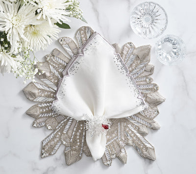 Influenced by the Zenith chandelier’s structure and ornamentation, the beaded Baccarat x Kim Seybert Zenith Placemat is a truly decorative piece. Intricate 3-dimensional beading techniques are used to create a magnified crystalized pattern. This sculptural pattern of the Zenith Placemat produces a crystalline structure with depth and movement. Glass and crystal gemstones adorn this sophisticated placemat and add an element of allure.
