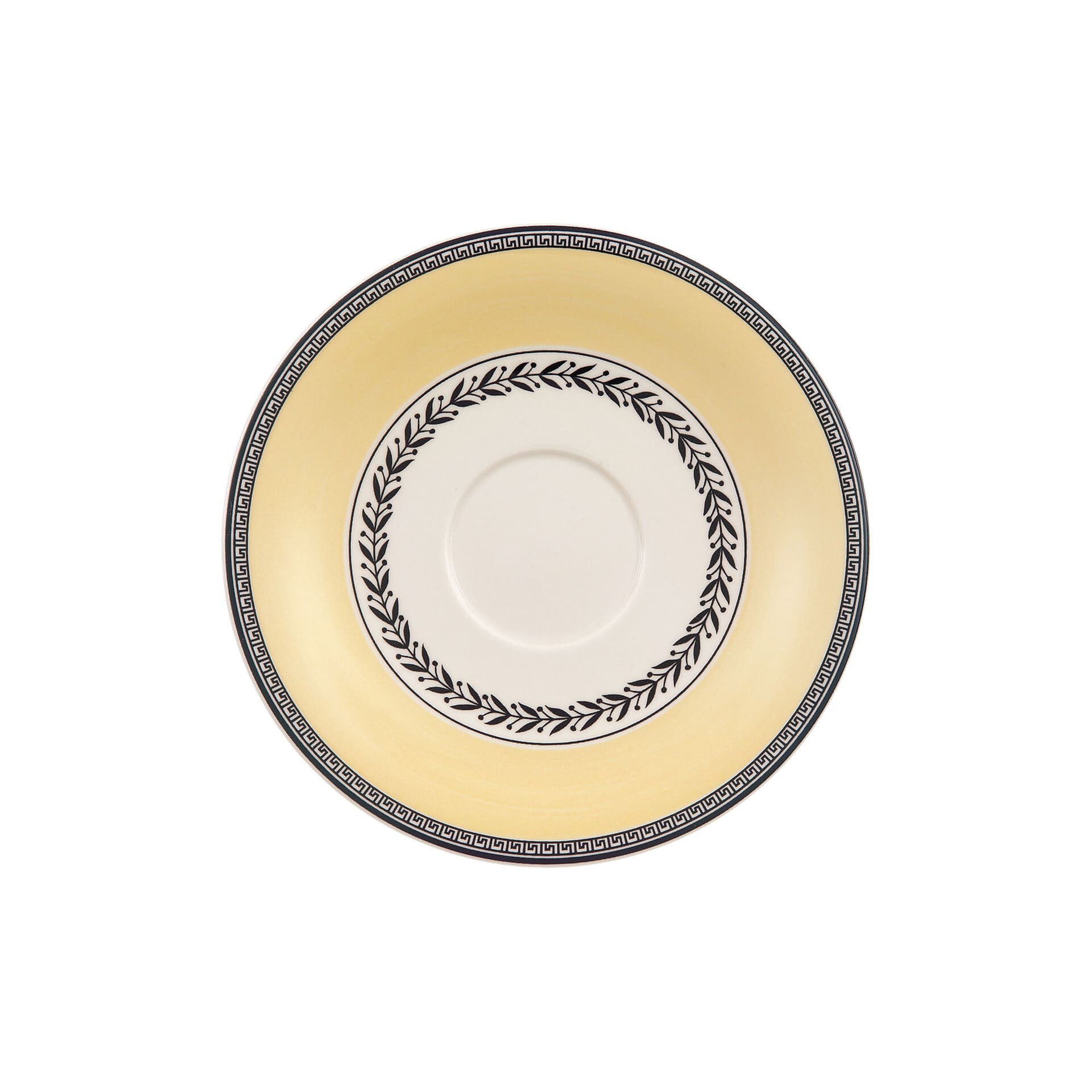 This breakfast cup saucer forms part of Villeroy Bochs country style pattern Audun Ferme. With this pattern Villeroy Boch exquisitely bridges past, present and future inspired by copper engraved designs from the turn of the last century. Pastoral scenes in black and white have been freshened up by a creamy yellow accent border and other graphic ornamentations. 4 patterns together yield a strong fashion statement to dress up your table or hang decorative plates on the wall. The 4 ranges are: Femme, Promenade, Fleur and Chase. Audun is a small village in what is now the Lorraine Provence of France and was the first pottery set up by the Boch members of the family.
