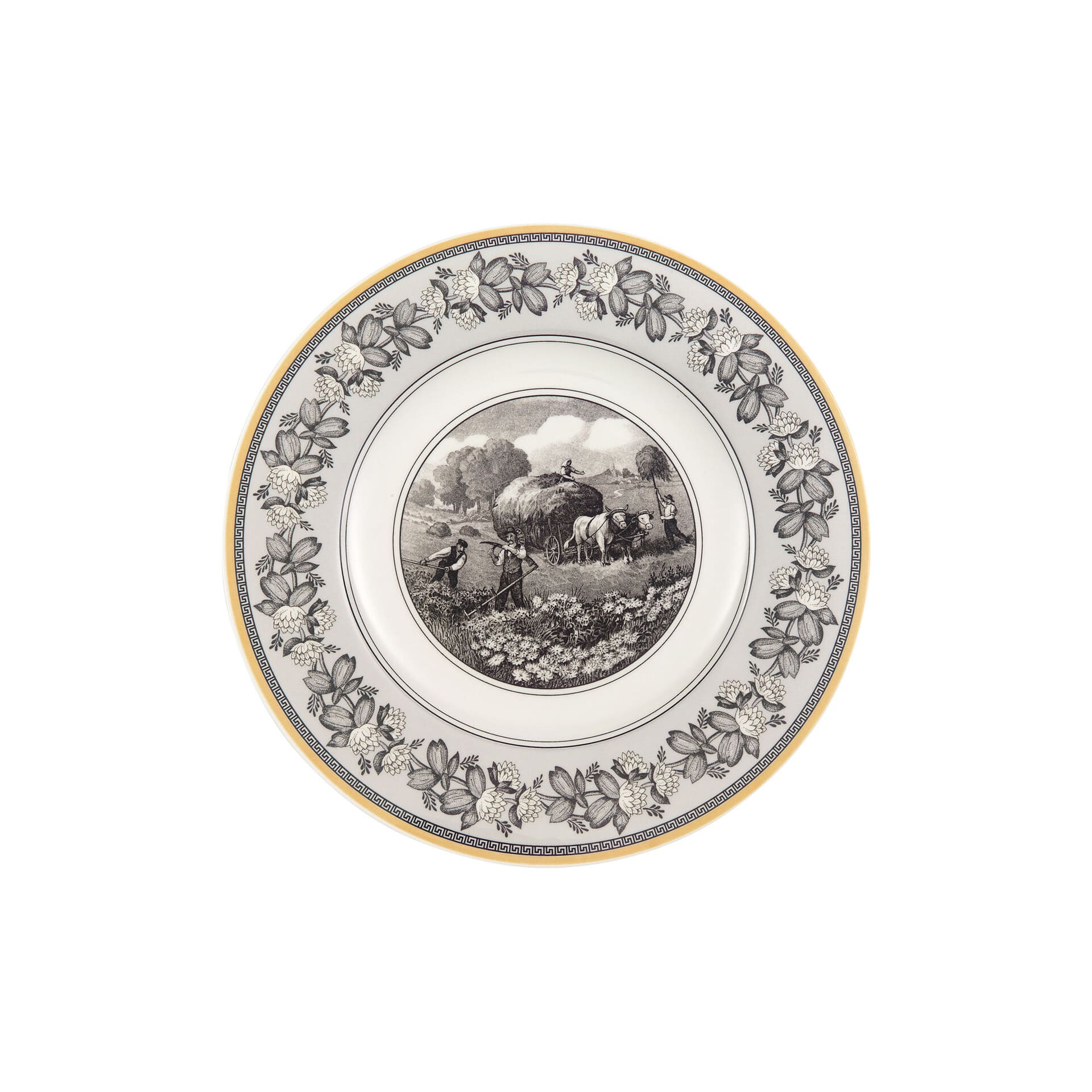 This flat plate forms part of Villeroy Bochs country style pattern Audun Ferme. With this pattern Villeroy Boch exquisitely bridges past, present and future inspired by copper engraved designs from the turn of the last century. Pastoral scenes in black and white have been freshened up by a creamy yellow accent border and other graphic ornamentations. 4 patterns together yield a strong fashion statement to dress up your table or hang decorative plates on the wall. The 4 ranges are: Femme, Promenade, Fleur and Chase. Audun is a small village in what is now the Lorraine Provence of France and was the first pottery set up by the Boch members of the family.
