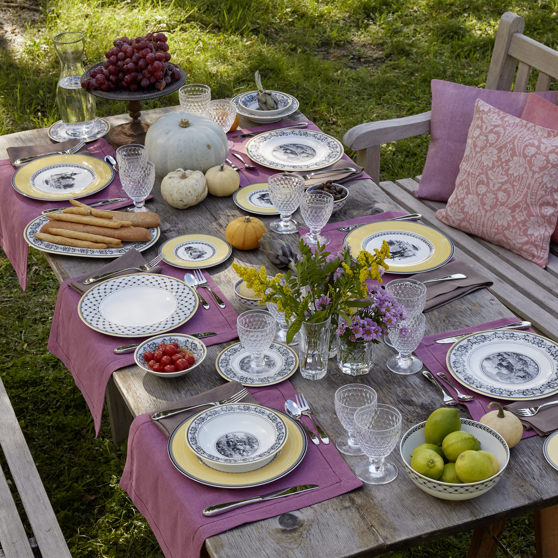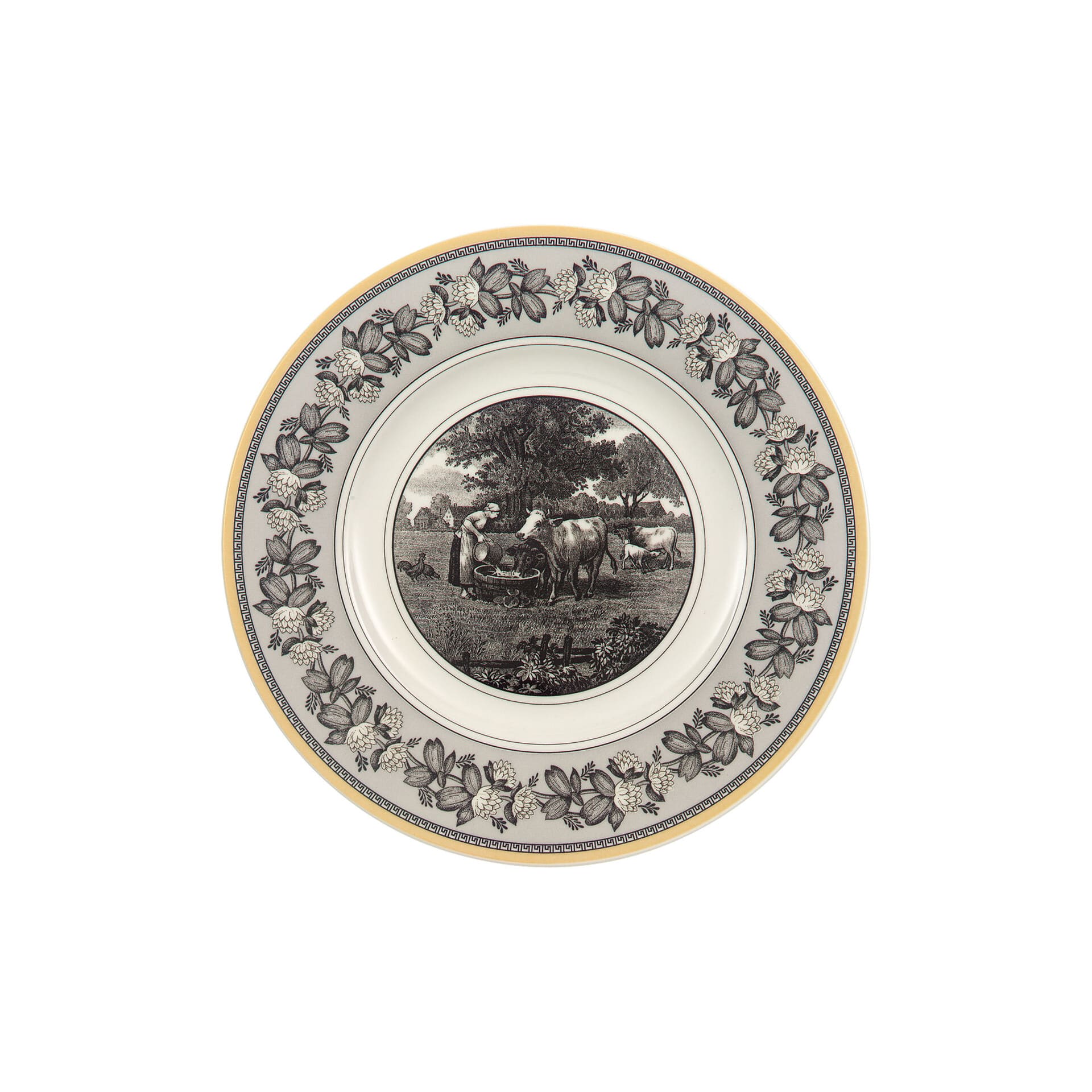 This salad plate forms part of Villeroy Bochs country style pattern Audun Ferme. With this pattern Villeroy Boch exquisitely bridges past, present and future inspired by copper engraved designs from the turn of the last century. Pastoral scenes in black and white have been freshened up by a creamy yellow accent border and other graphic ornamentations. 4 patterns together yield a strong fashion statement to dress up your table or hang decorative plates on the wall. The 4 ranges are: Femme, Promenade, Fleur and Chase. Audun is a small village in what is now the Lorraine Provence of France and was the first pottery set up by the Boch members of the family.