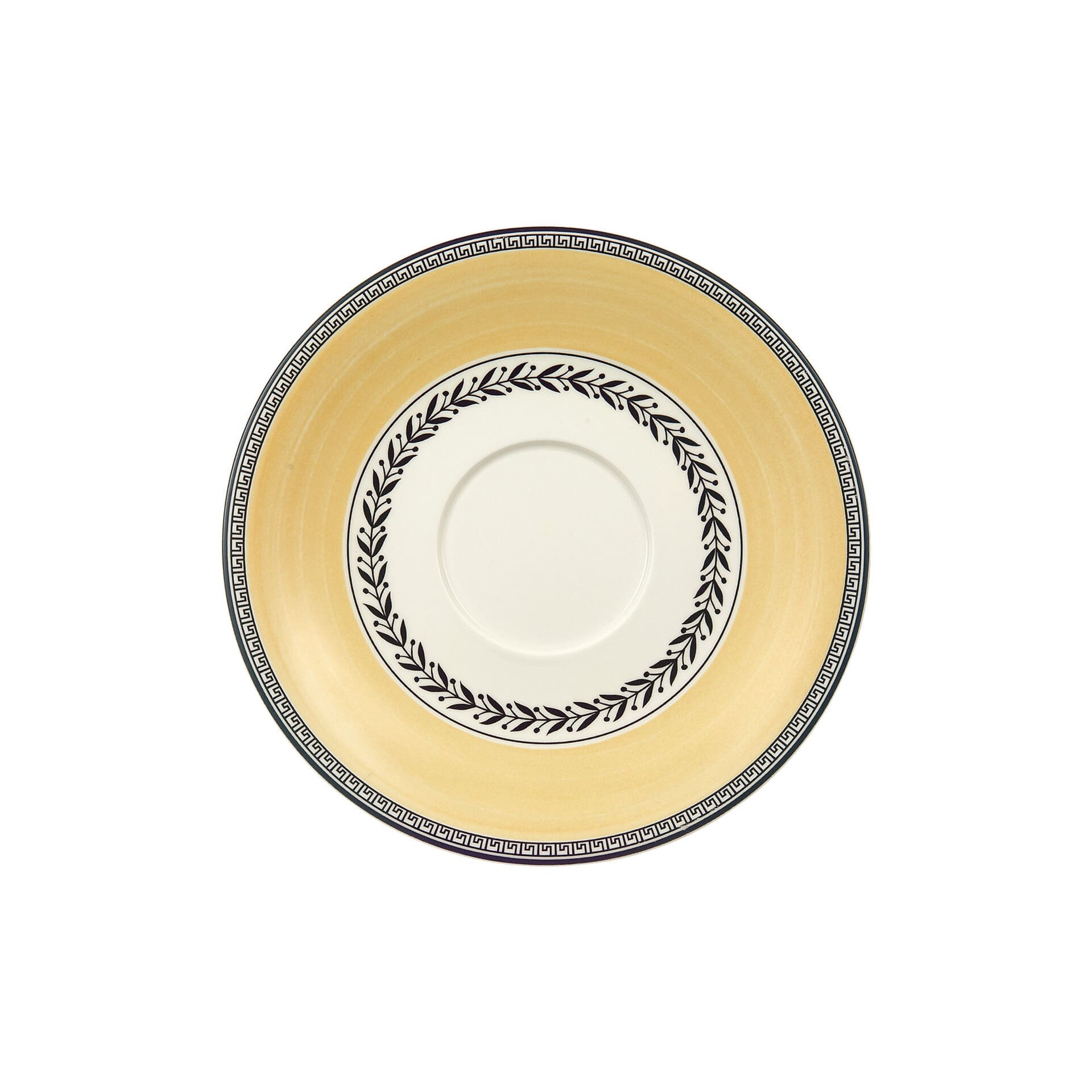 This saucer espresso cup forms part of Villeroy Bochs country style pattern Audun Ferme. With this pattern Villeroy Boch exquisitely bridges past, present and future inspired by copper engraved designs from the turn of the last century. Pastoral scenes in black and white have been freshened up by a creamy yellow accent border and other graphic ornamentations. 4 patterns together yield a strong fashion statement to dress up your table or hang decorative plates on the wall. The 4 ranges are: Femme, Promenade, Fleur and Chase. Audun is a small village in what is now the Lorraine Provence of France and was the first pottery set up by the Boch members of the family.