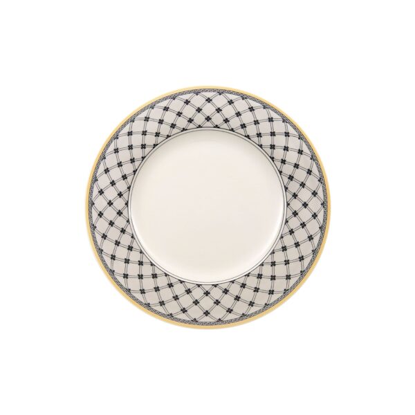 This salad plate forms part of Villeroy Bochs country style pattern Audun Promenade. With this pattern Villeroy Boch exquisitely bridges past, present and future inspired by copper engraved designs from the turn of the last century. Pastoral scenes in black and white have been freshened up by a creamy yellow accent border and other graphic ornamentations. 4 patterns together yield a strong fashion statement to dress up your table or hang decorative plates on the wall. The 4 ranges are: Femme, Promenade, Fleur and Chase. Audun is a small village in what is now the Lorraine Provence of France and was the first pottery set up by the Boch members of the family.